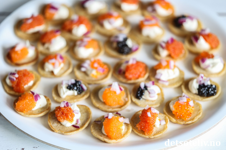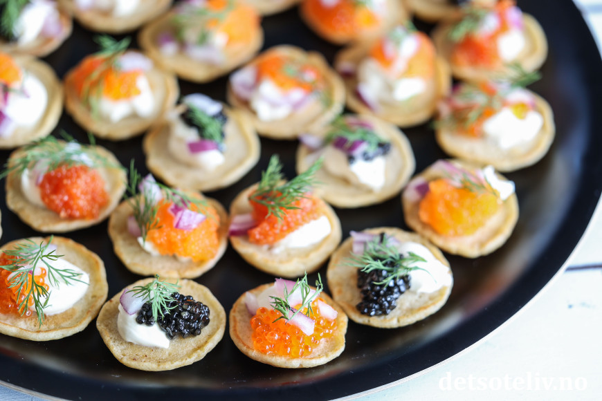Blinis er gode med mange slags toppinger, men her har du den originale varianten som toppes med tykk rømme, finhakket rødløk, dill og kaviar. Dette blir selvfølgelig FANTASTISK på smak dersom du bruker skikkelig eksklusiv kaviar, men også veldig godt med mer ordinære varianter. Eller bruk en kombinasjon som jeg har gjort her.