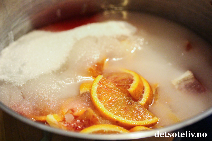 Etter at det raskt ble tomt for Klementinmarmeladen jeg lagde for en kort stund siden, fikk jeg lyst til å lage Blodappelsinmarmelade denne gangen. Jeg var litt nysgjerrig på hvilken farge blodappelsinmarmeladen ville få, må jeg innrømme. Den endte opp med å få en nokså ordinær farge, men kanskje litt mørkere oransje enn vanlig appelsinmarmelade..