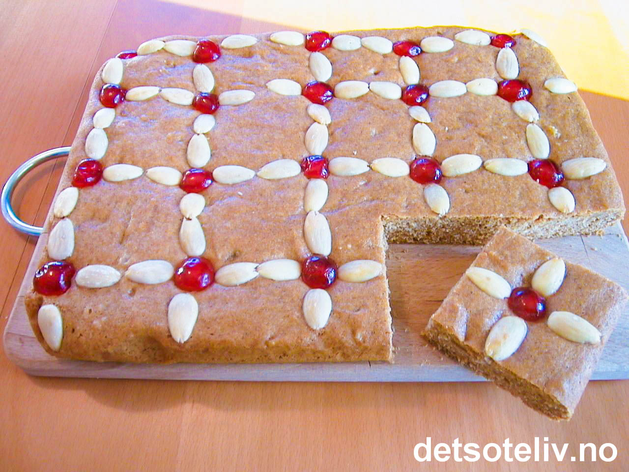 Ha deigen i en liten, bakepapirkledd langpanne (ca 20x30 cm). La bakepapiret stikke litt opp av formen på sidene, slik at det er lett å løfte ut kaken etter at den er stekt. Glatt til overflaten med en smørekniv.