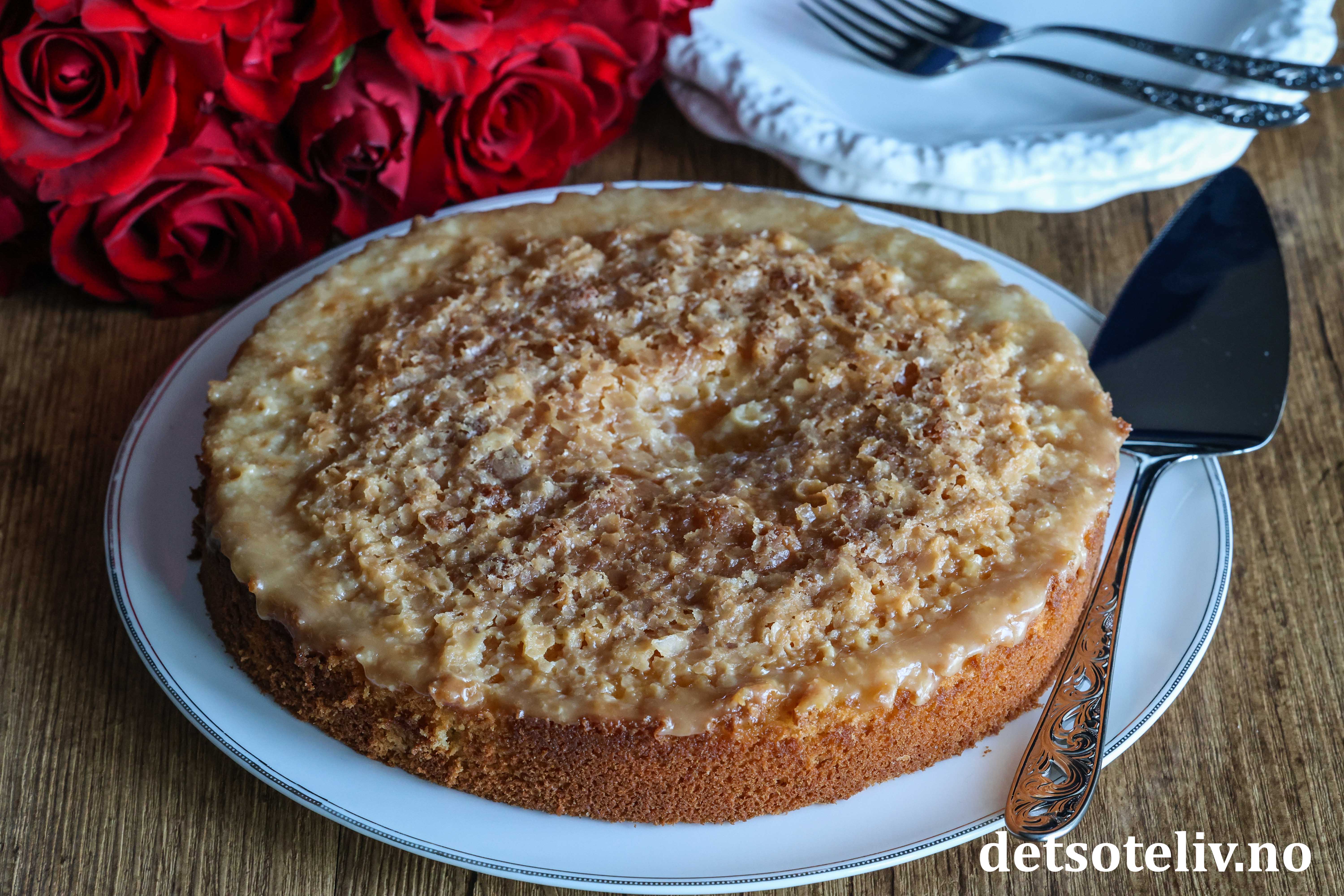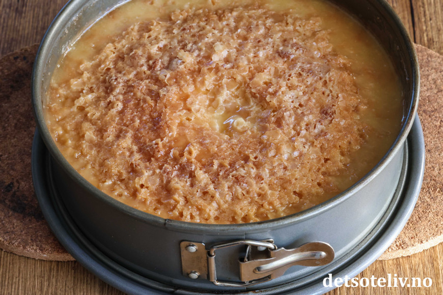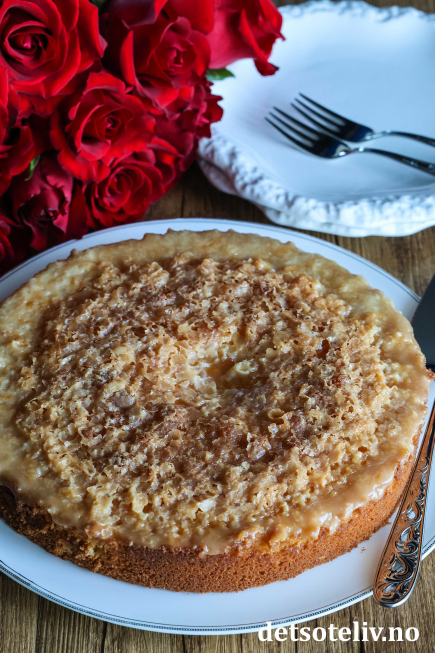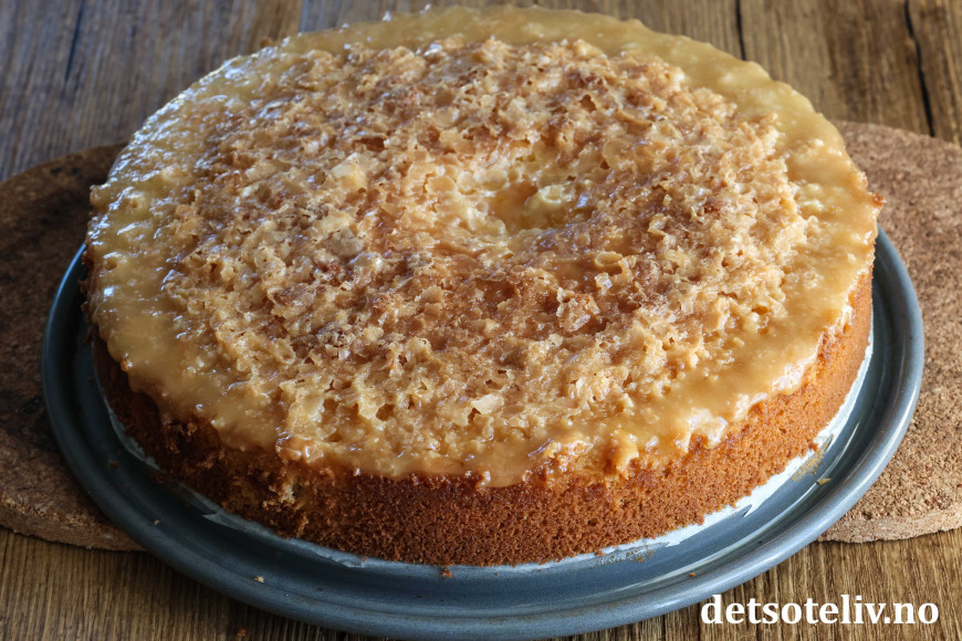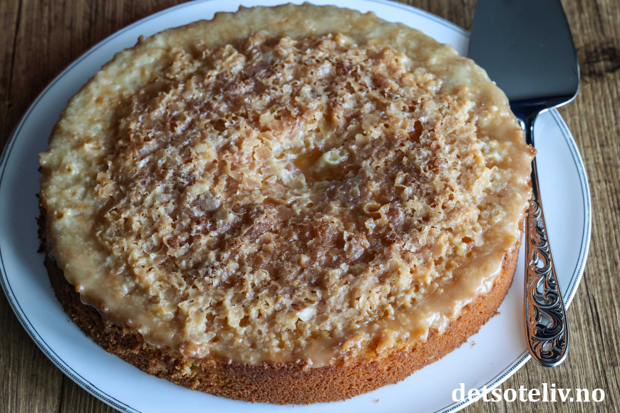 Glasuren danner et karamellisert blondemønster på toppen av kaken. 😍
