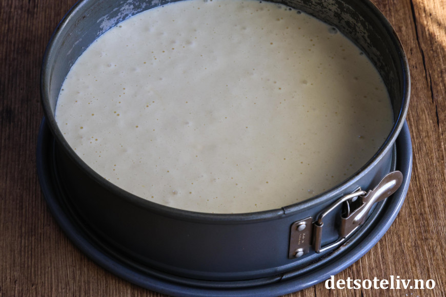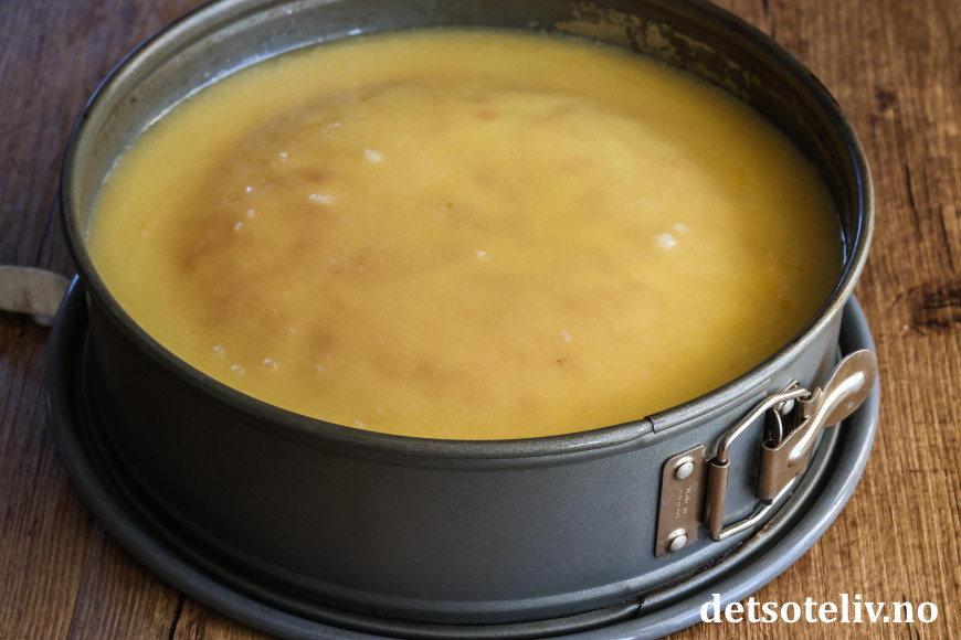 Ha deigen i en rund form (24 cm i diameter) med bakepapir i bunnen.