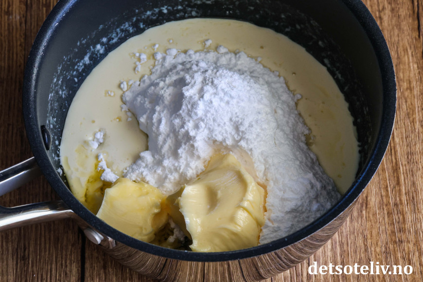 Mens kaken steker, har du melis, smør og fløte i en liten kjele.