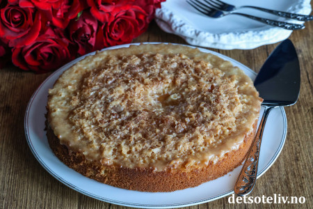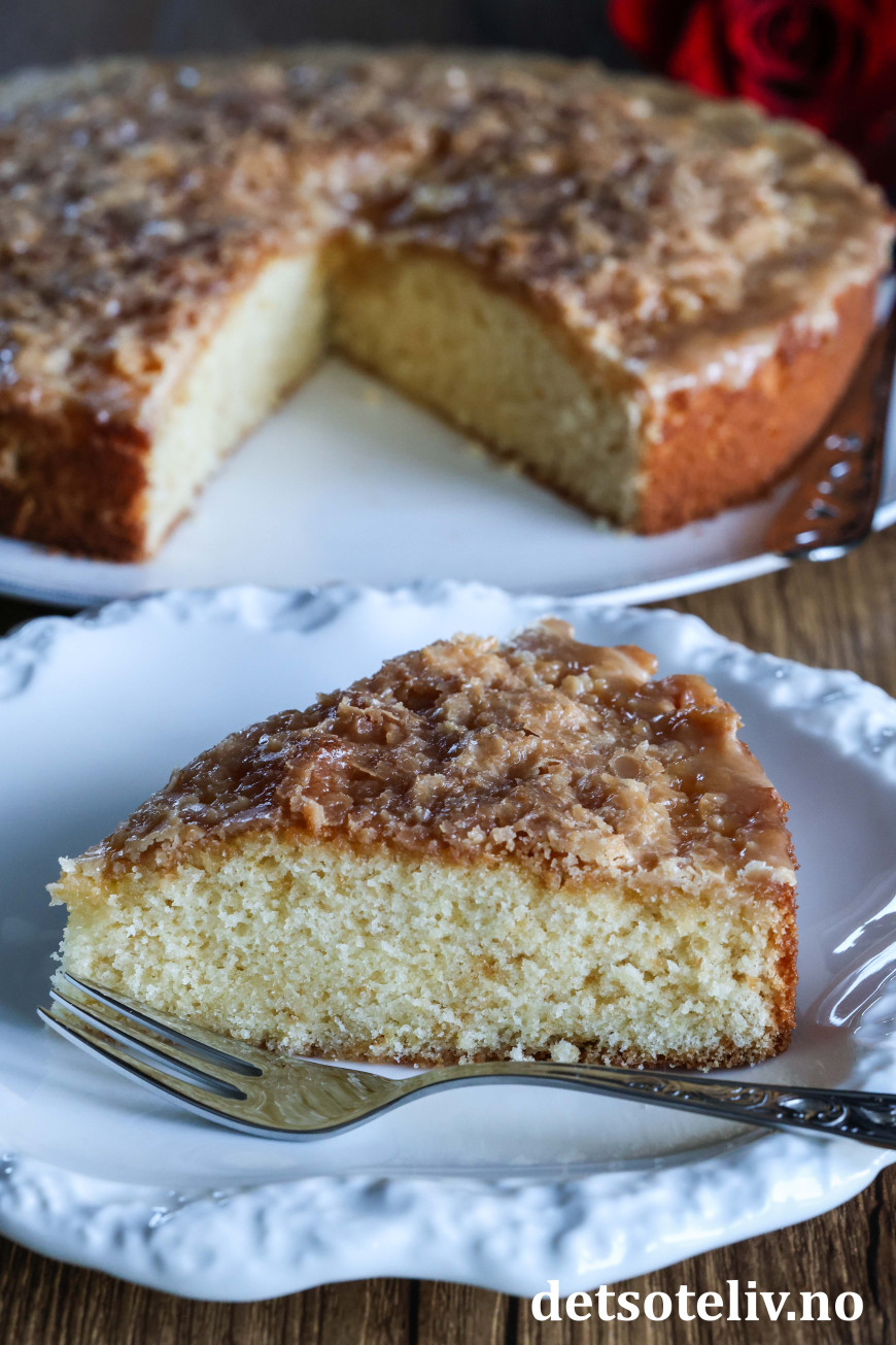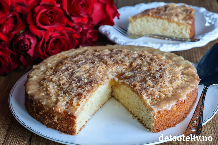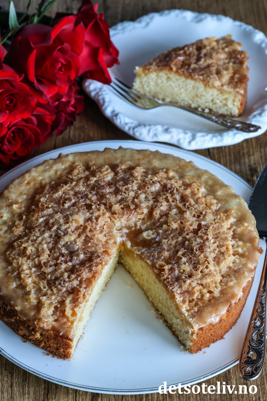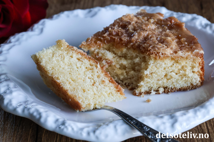 Saftig og myk formkake med et tynt lag karamellglasur!