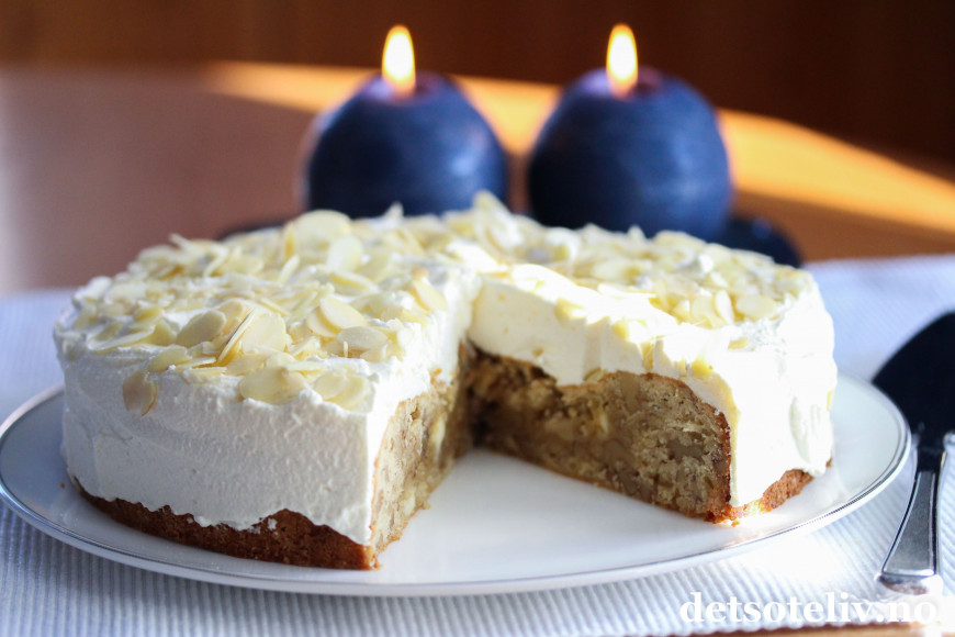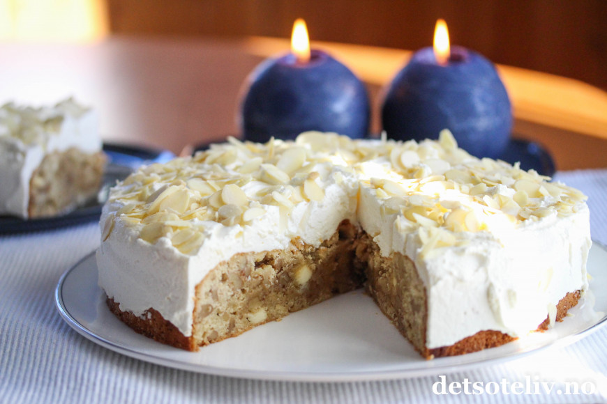 Ha deigen i en rund form (24 cm i diameter) med bakepapir i bunnen. Stek kakene midt i ovnen ved 175°C i ca. 25 minutter. Kaken skal være litt bløt i midten og fortsatt lys i fargen. La kaken avkjøles i formen til den er helt kald.