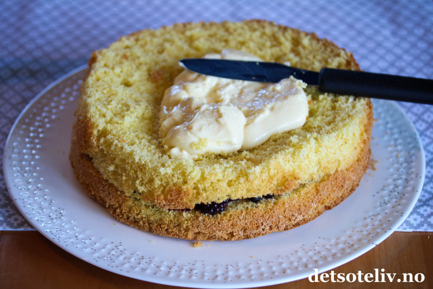 Legg på den andre kakebunnen og smør på vaniljekremen.