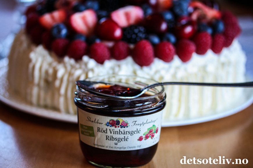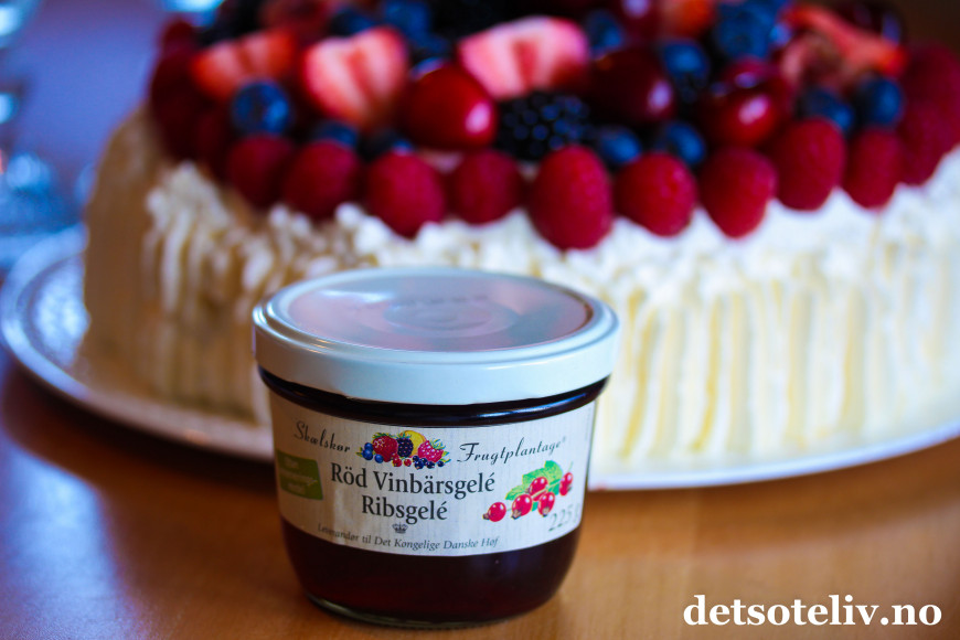 Når bærene pyntes med ripsgele, blir kaken så utrolig vakker!