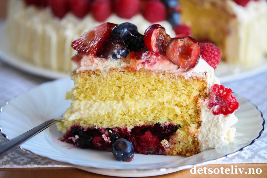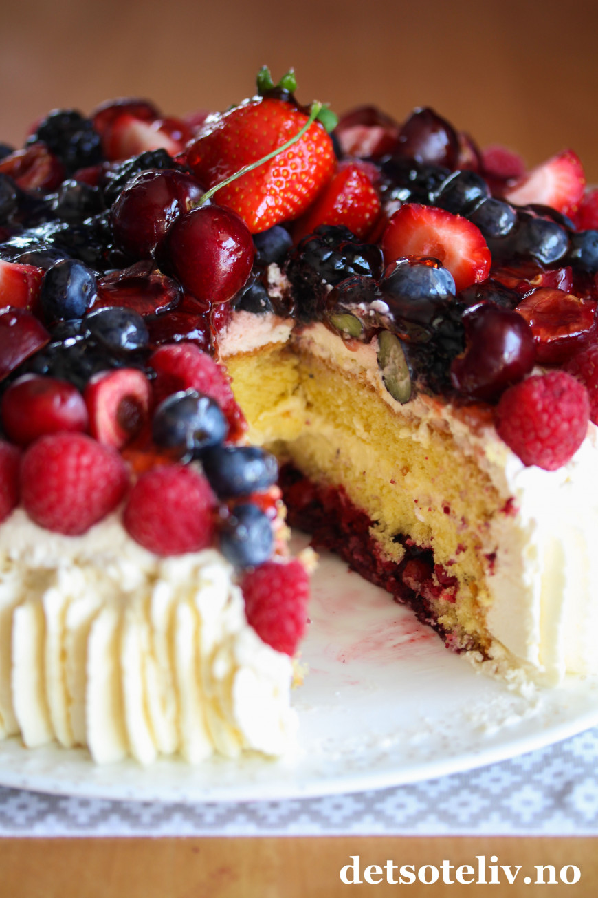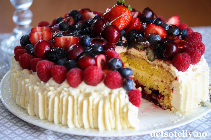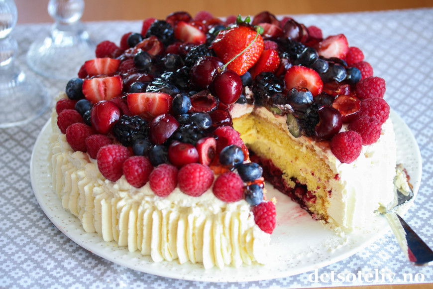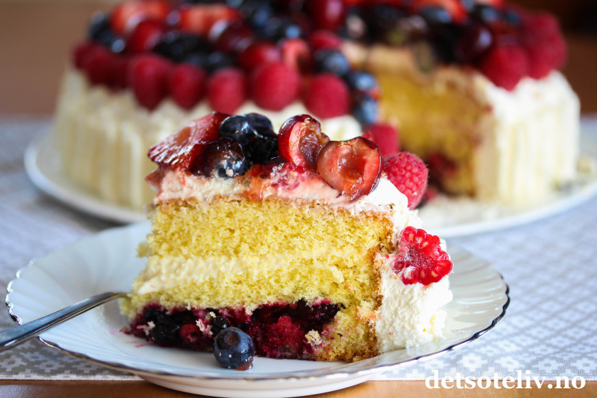 Bløtkake er noe vi alle er glade i. Denne bløtkaken er fylt med vaniljekrem, pisket krem og massevis av bær!