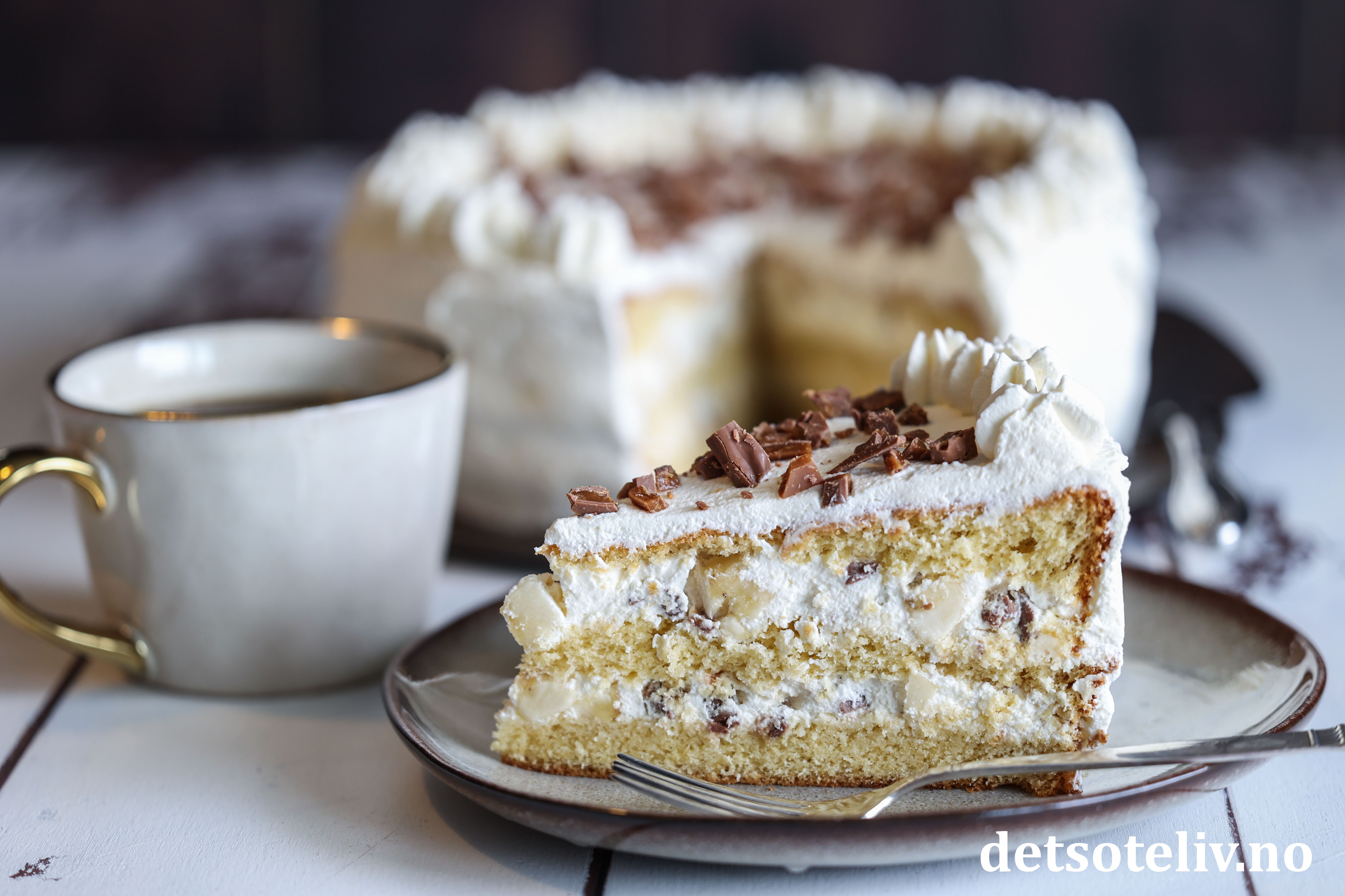 Bløtkaken smaker best samme dag mens kremen er fersk og luftig, og bananskivene i fyllet fortsatt helt lyse i fargen.