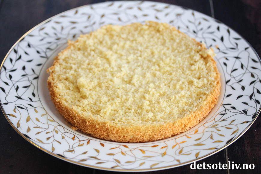 Avkjøl kaken helt i formen. Ta kaken ut av formen og del den i to bunner.