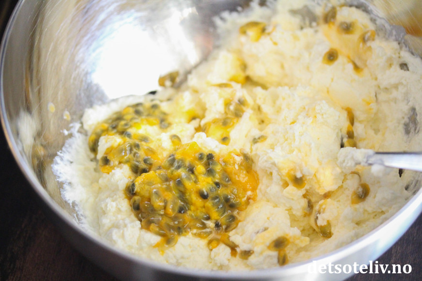 Pisk kremfløten til tykk krem. Vend inn innholdet av to pasjonsfrukter.
