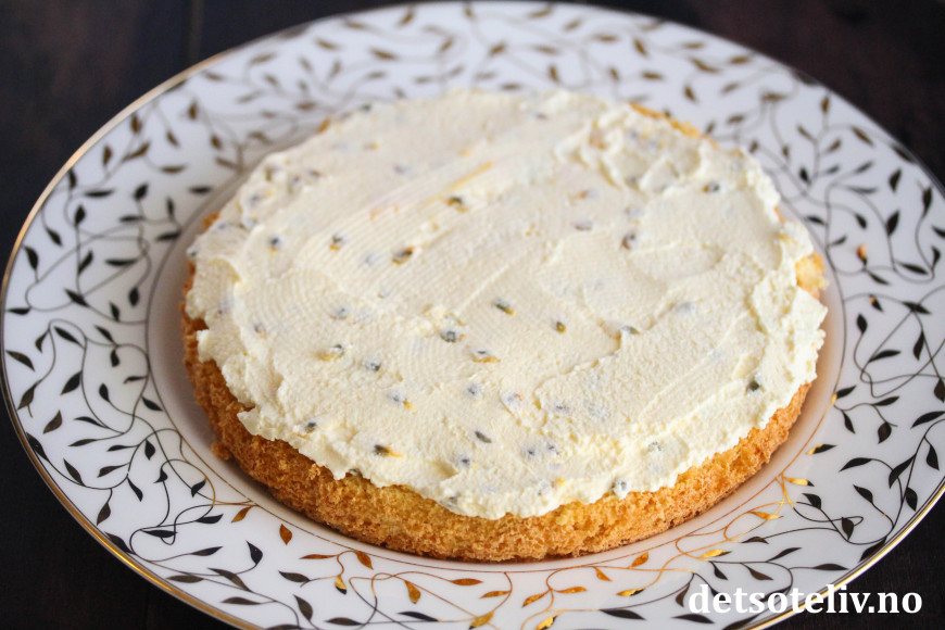 ♥ Hvis du vil, kan du dynke kakebunnene med litt melk eller appelsinjuice før du fyller kaken med pasjonsfruktkrem.