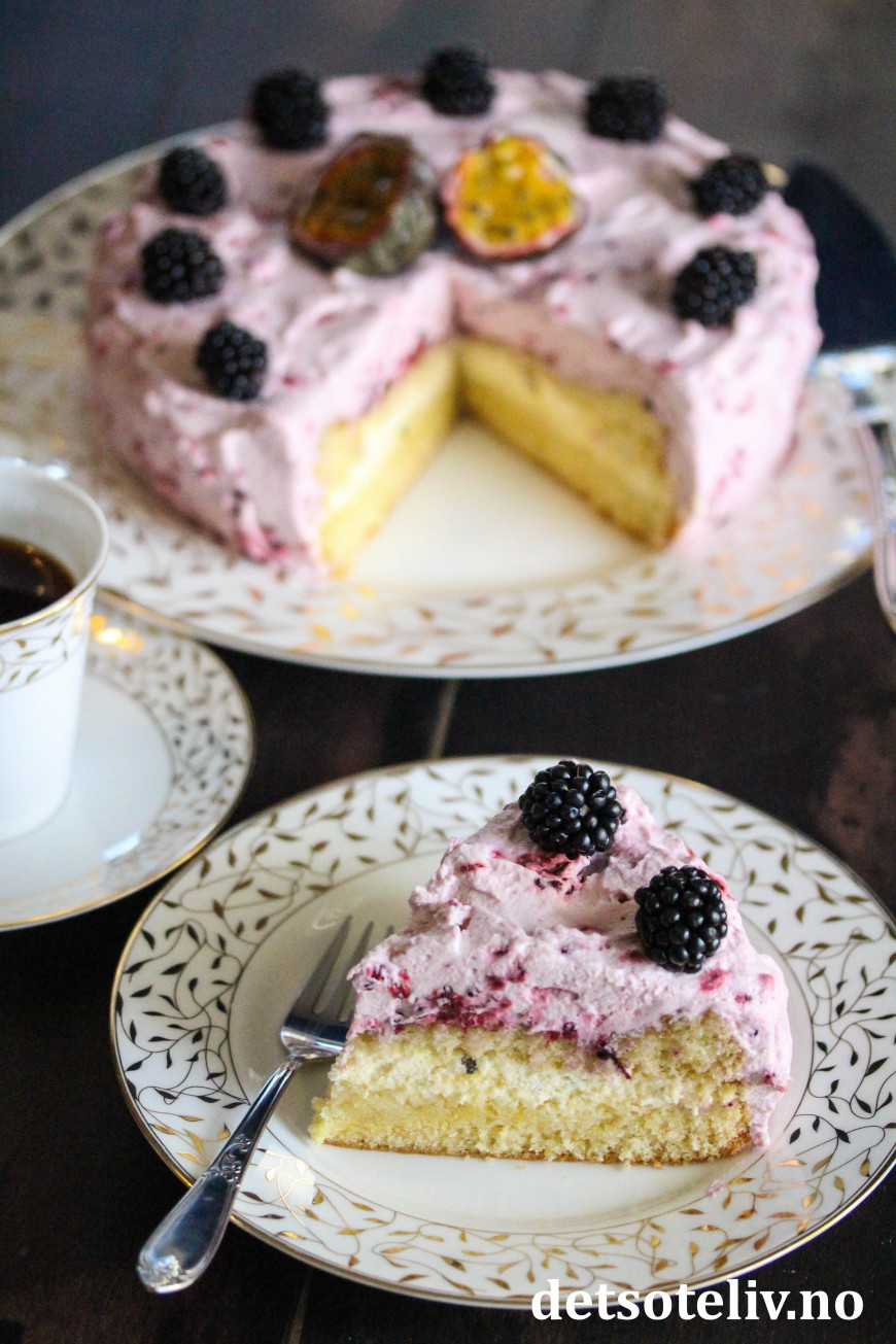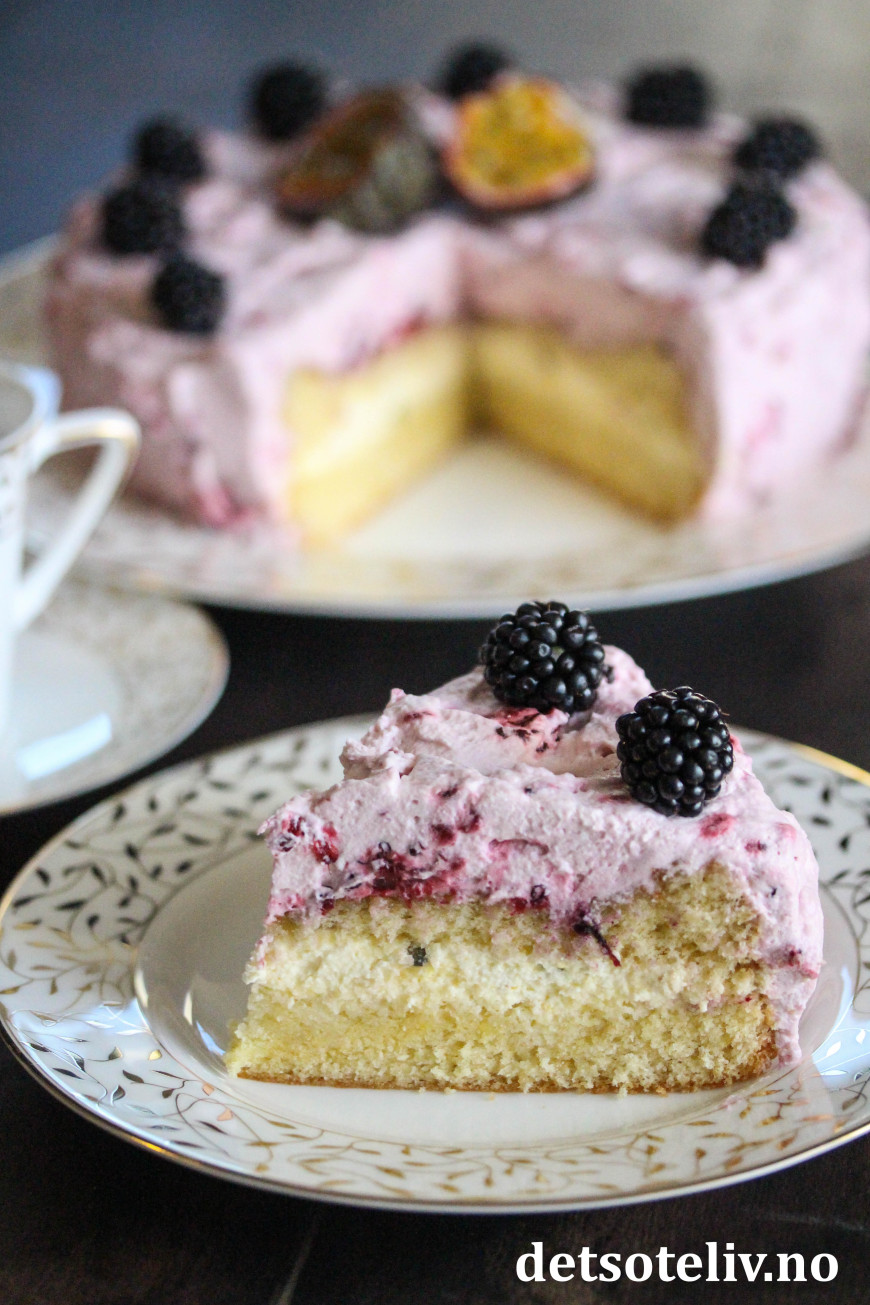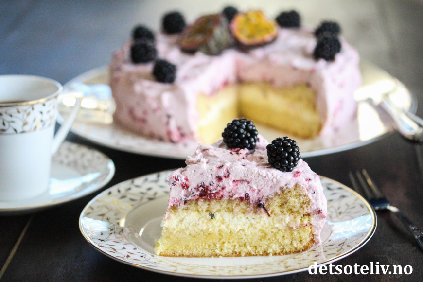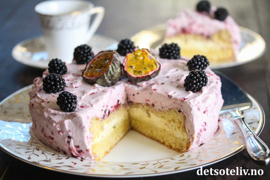 Denne bløtkaken er dekket med en nydelig bjørnebærkrem, mens kremen i fyllet er smaksatt med pasjonsfrukt. Dette gir en bløtkake med vakre farger og med frisk, tropisk smak.