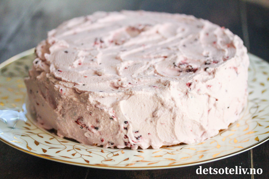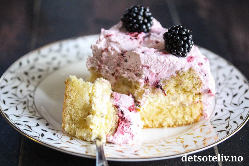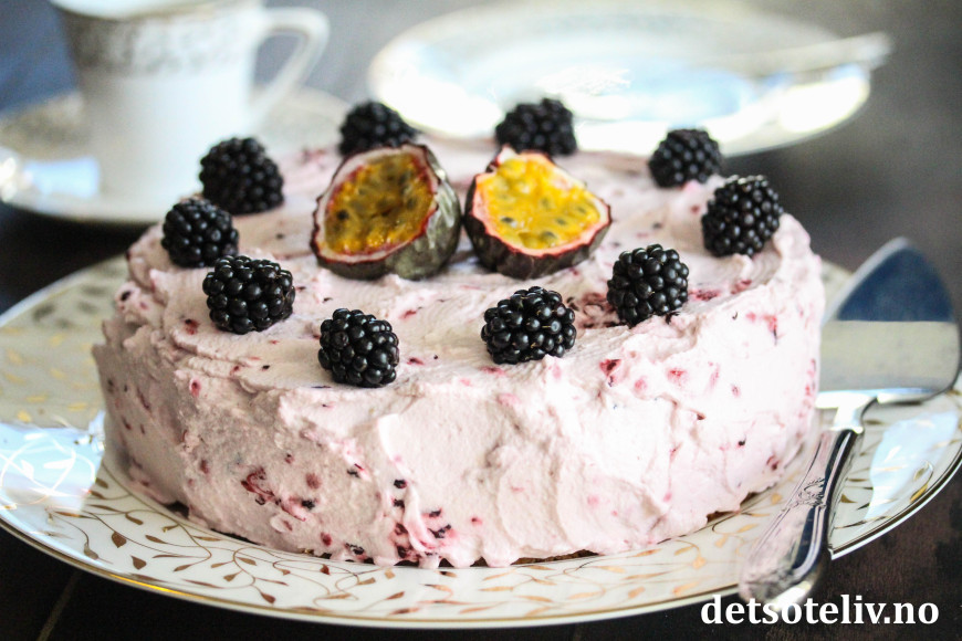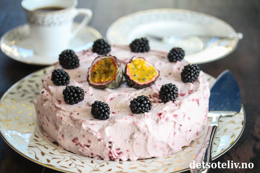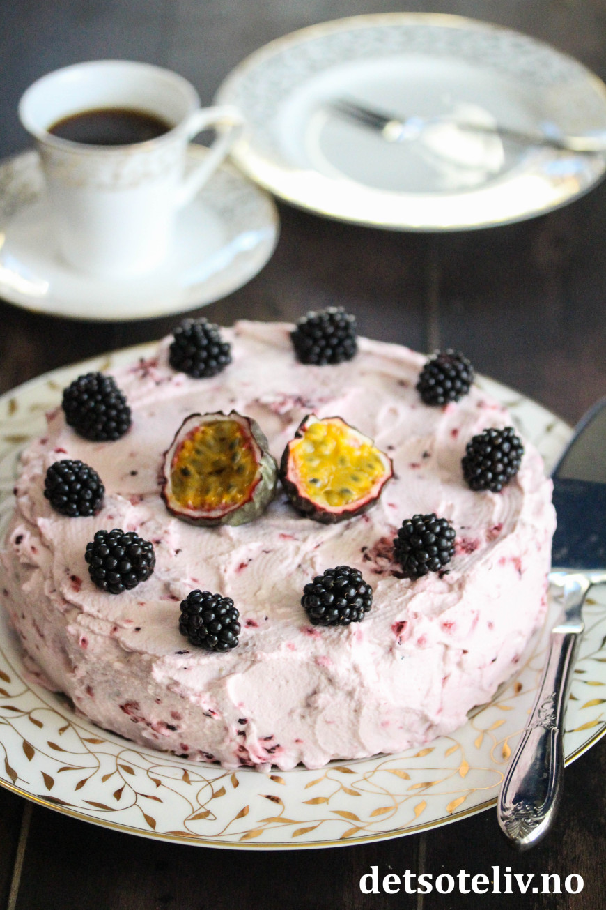 Denne bløtkaken er dekket med en nydelig bjørnebærkrem, mens kremen i fyllet er smaksatt med pasjonsfrukt. Dette gir en bløtkake med vakre farger og med frisk, tropisk smak.