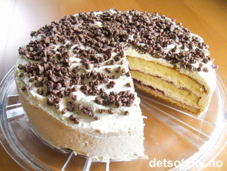 Kaken blir god og saftig av å stå og trekke i et par timer før servering, men bør helst serveres samme dag som den er laget, slik at kremen er fersk.