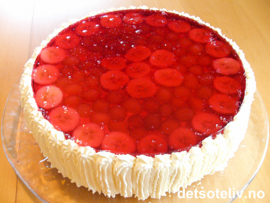 Dekk toppen av kaken med et tynt lag vaniljekrem. Legg på et mønster med halve druer og bananskiver (ikke del opp bananen før geléen er klar til å ha på kaken, slik at bananskivene ikke blir brune).