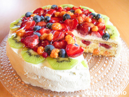 Bland resten av den piskede kremen med vaniljesukker. Dekk kaken med kremen. Pynt deretter toppen av kaken med kiwi, jordbær, multer og blåbær.