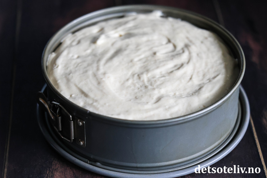 Ha deigen i en kakeform (24 cm i diameter) med bakepapir i bunnen.