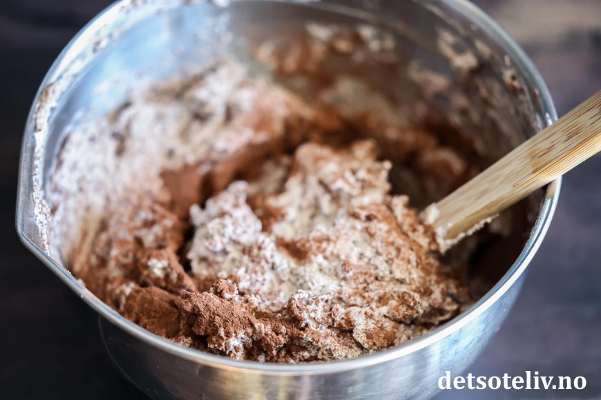 Bland sukker og kakaopulver. Vend dette også inn i kremen med slikkepotten.