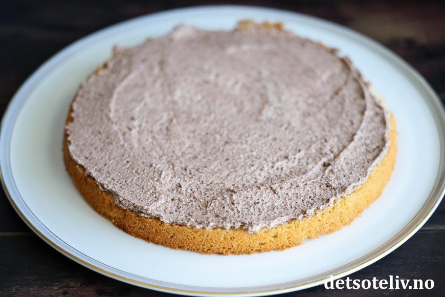 Legg på den andre kakebunnen. Dynk også denne med kaffe. Smør så over et lag sjokoladekrem.
