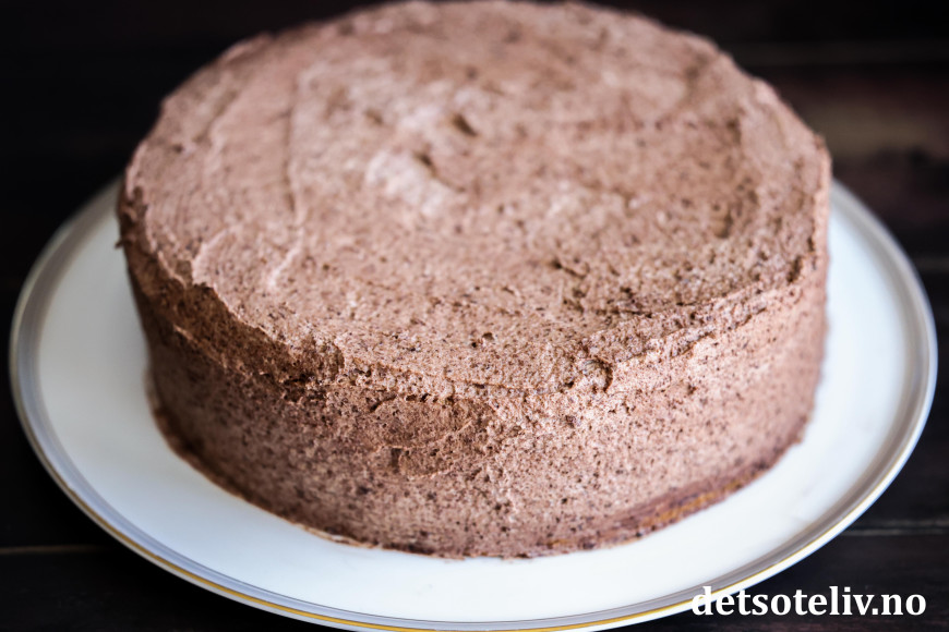 Smør resten av sjokoladekremen jevnt over hele kaken.