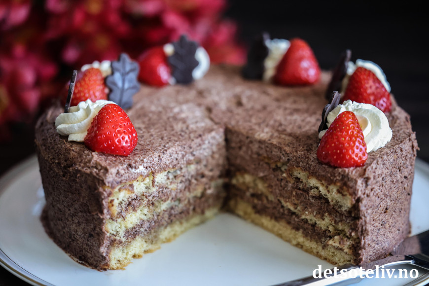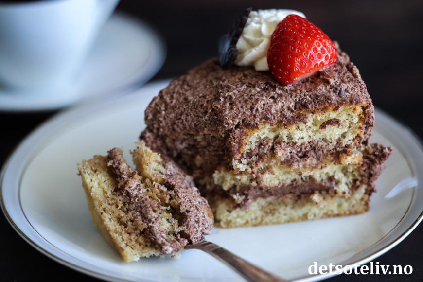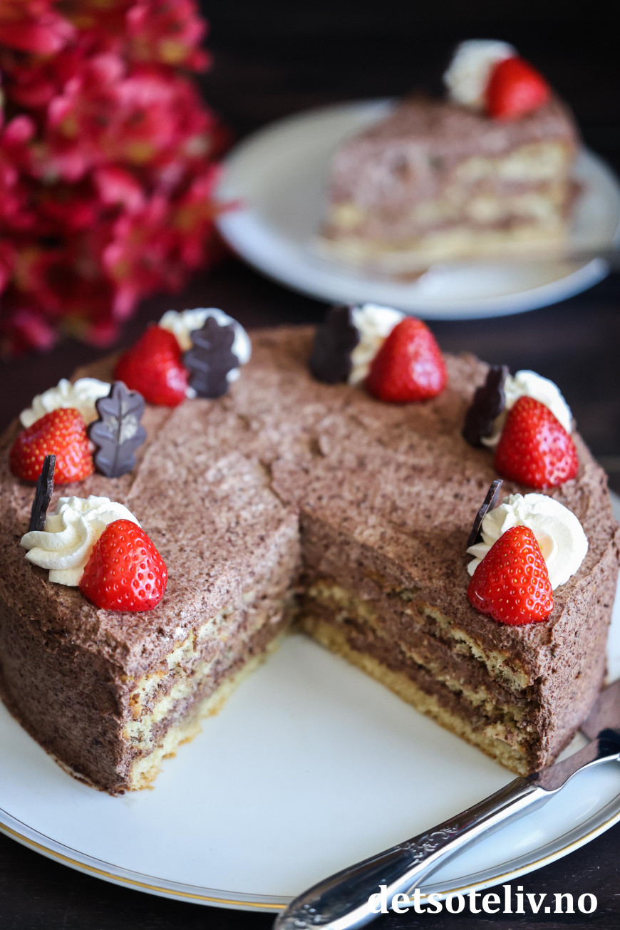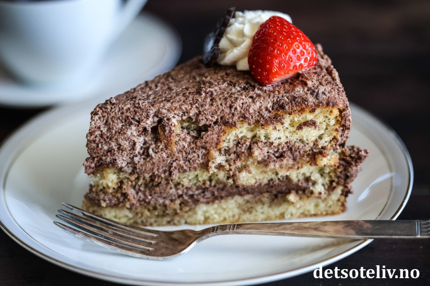 Dette er en nydelig bløtkake, som dynkes med kaffe og fylles med en utrolig deilig sjokoladekrem!