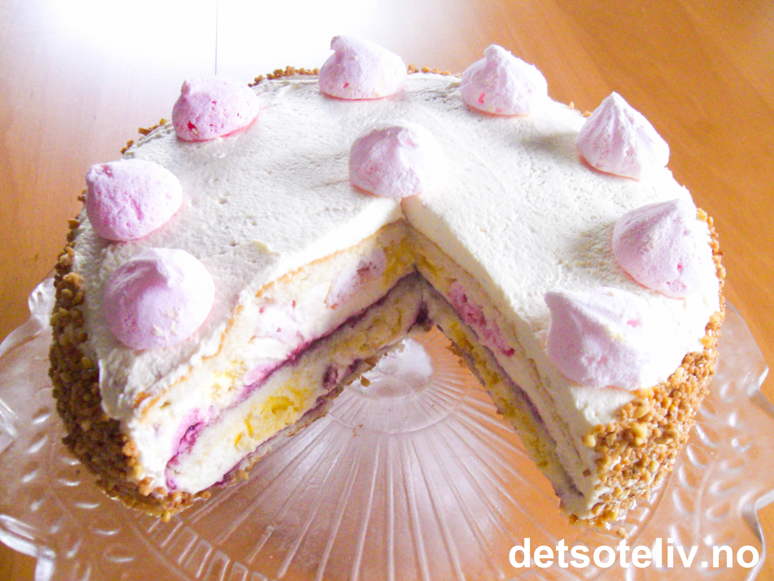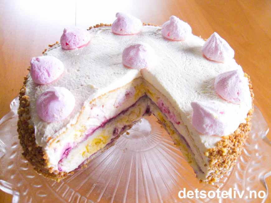 Del kakebunnen i tre lag. Dynk kakebunnene eventuelt med litt melk. Fyll hvert kakelag ved å først smøre på bringebærsyltetøy. Dekk deretter med pisket krem og trykk pikekyss god ned i kremen.