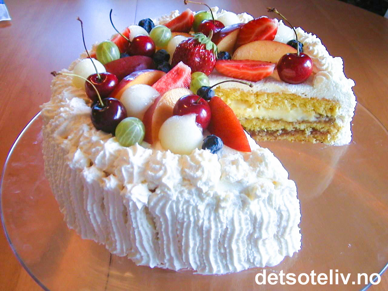 Kaken pyntes med søt, pisket krem og masse, deilig, frisk frukt og bær!