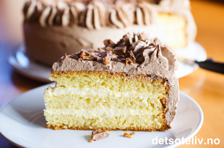 Del kaken i 3 bunner og dynk dem med litt melk. Fordel vaniljekrem mellom lagene.