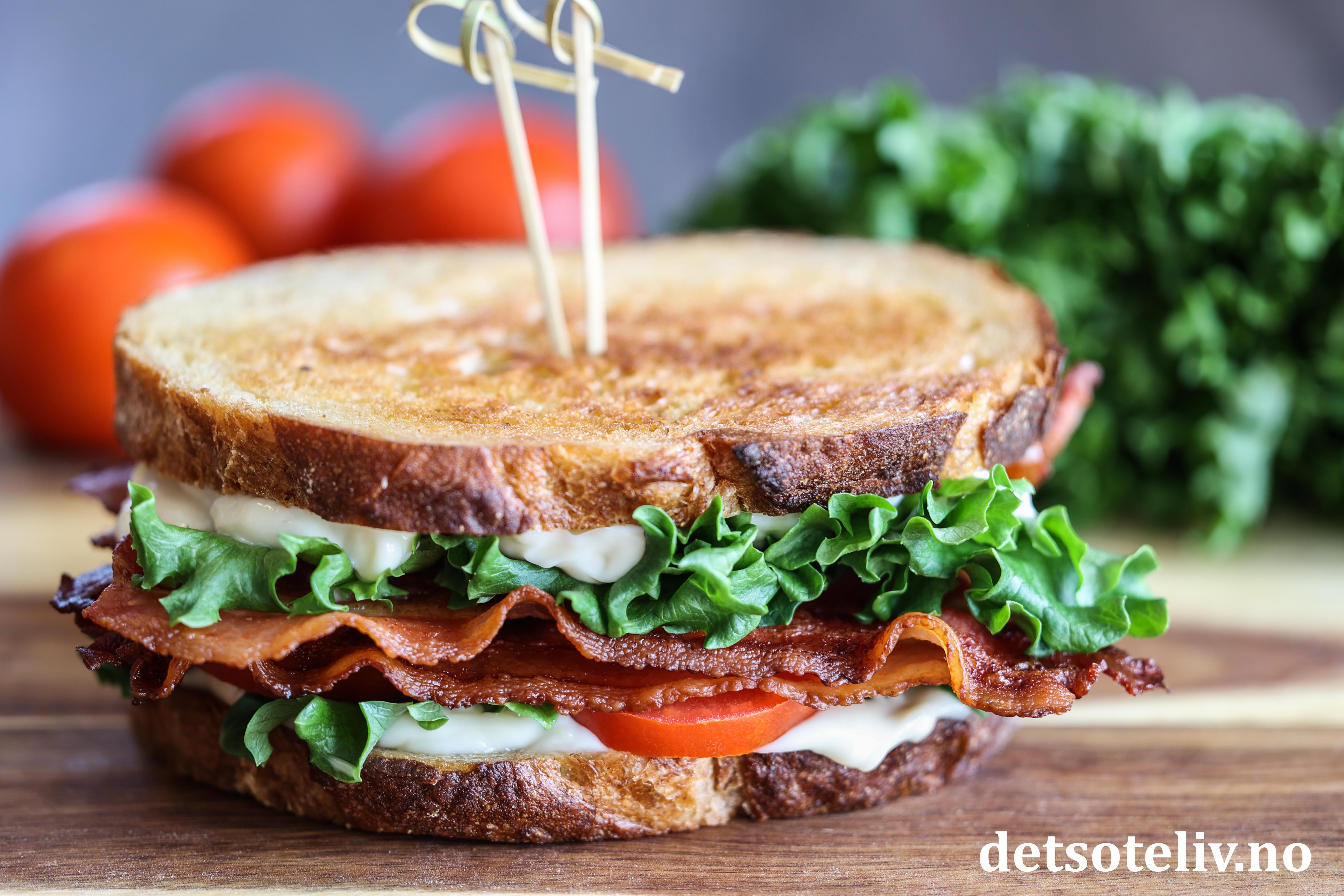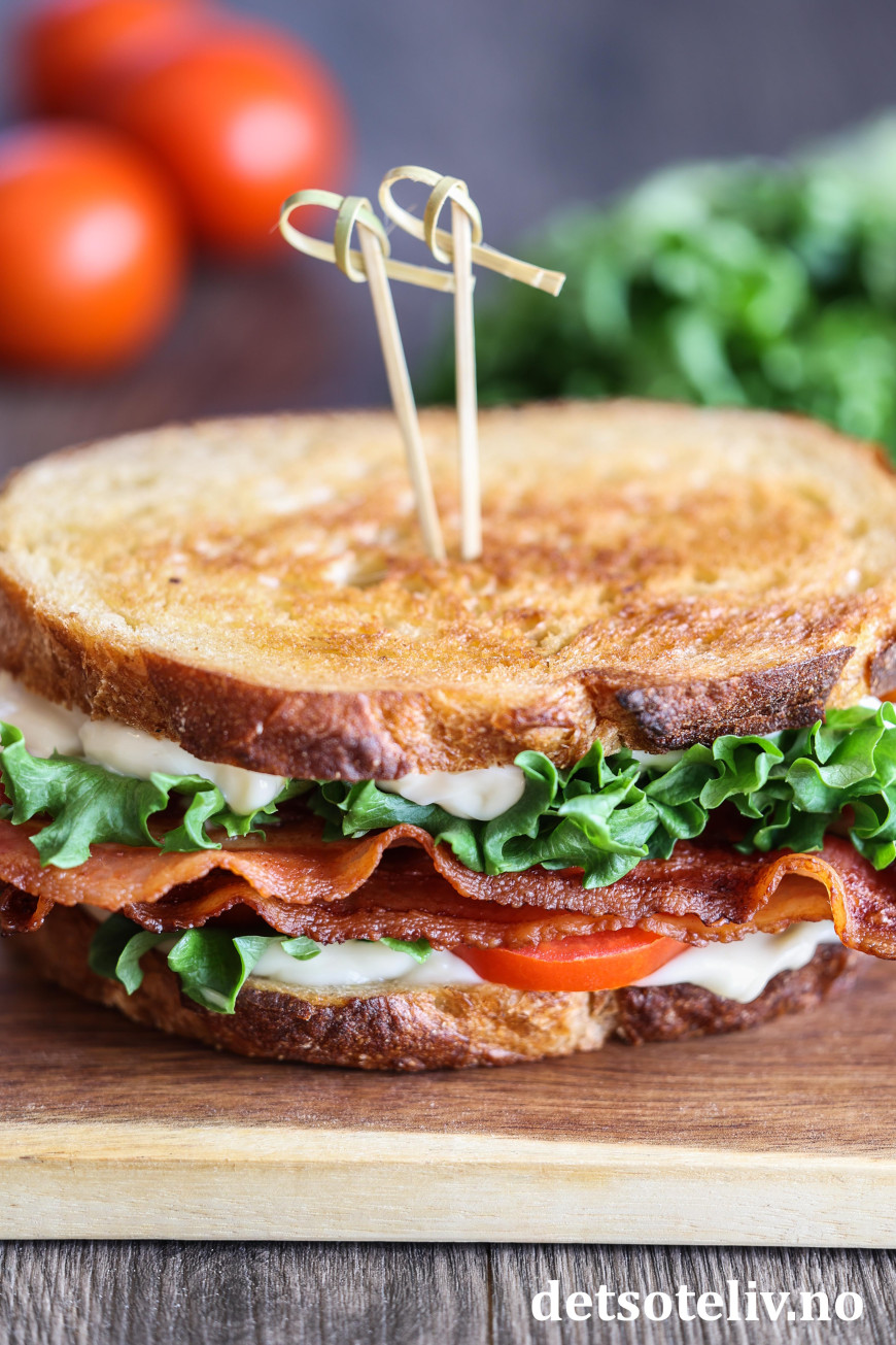To sprøstekte toast fylles her med bacon (B for bacon), salat (L for lettuce) og tomat (T for tomato) = BLT Sandwich! 😃