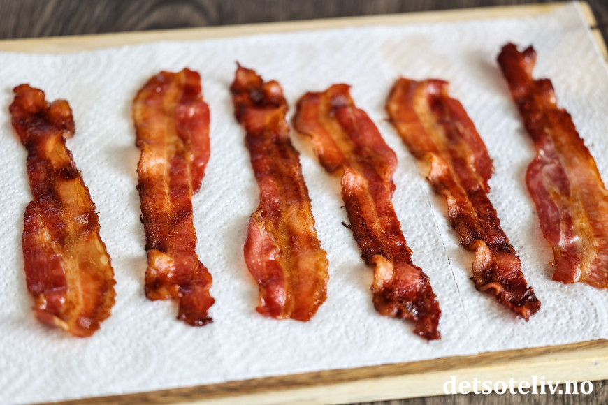Stek bacon midt i ovnen ved 200°C i 10 - 15 minutter, eller til du ser at det begynner å få god farge og bli sprøtt. Legg de stekte baconskivene på kjøkkenpapir for å fjerne overflødig fett.