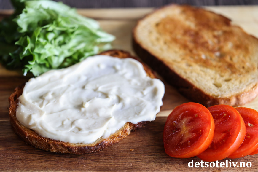 Smør godt med hvitløksmajones på den nederste toasten. Dekk med salatblad og tomatskiver.