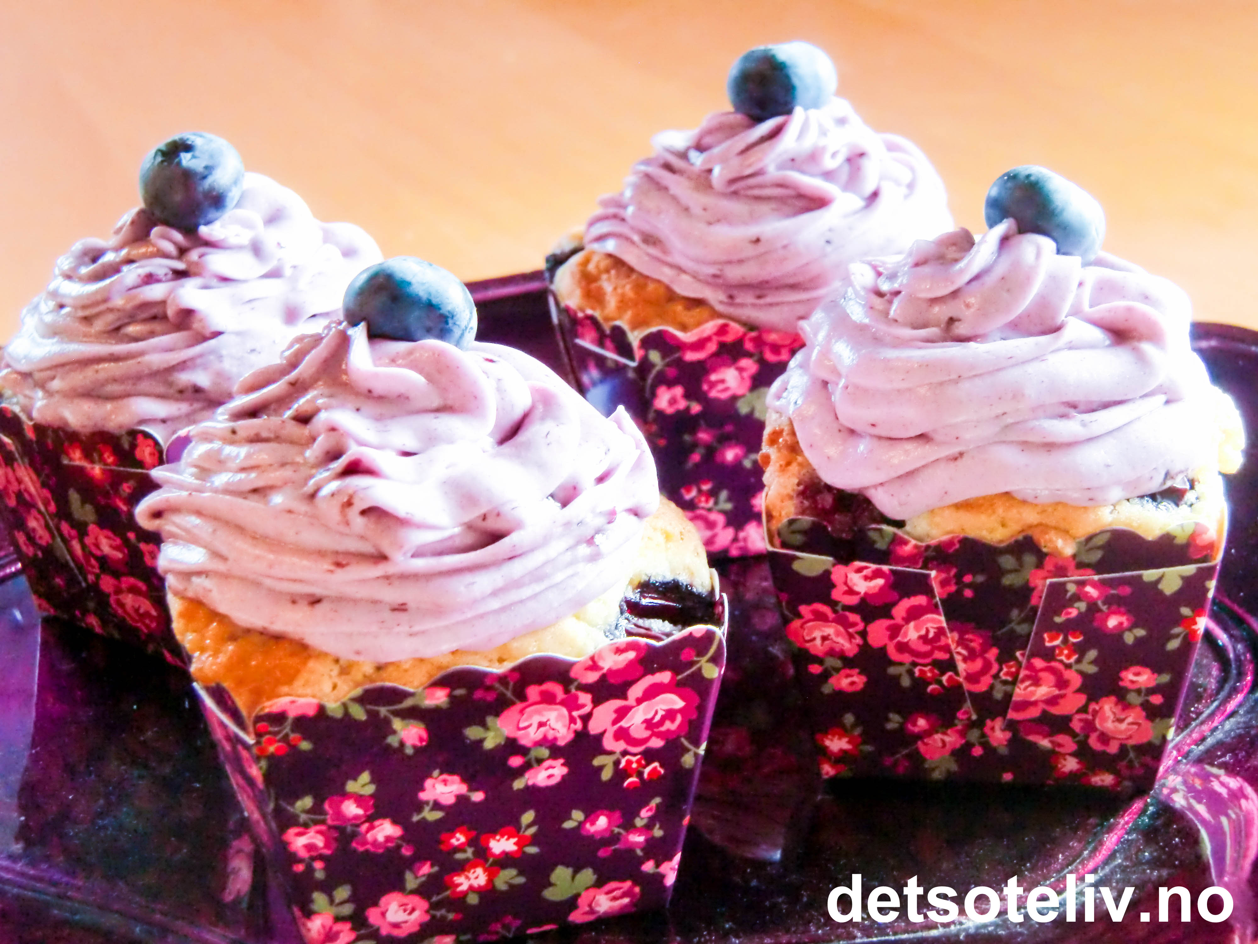 Ha kremen i en kakesprøyte og lag vakre kremtopper oppå muffinsene (se tips). Pynt med ett blåbær på toppen av hver kake.
