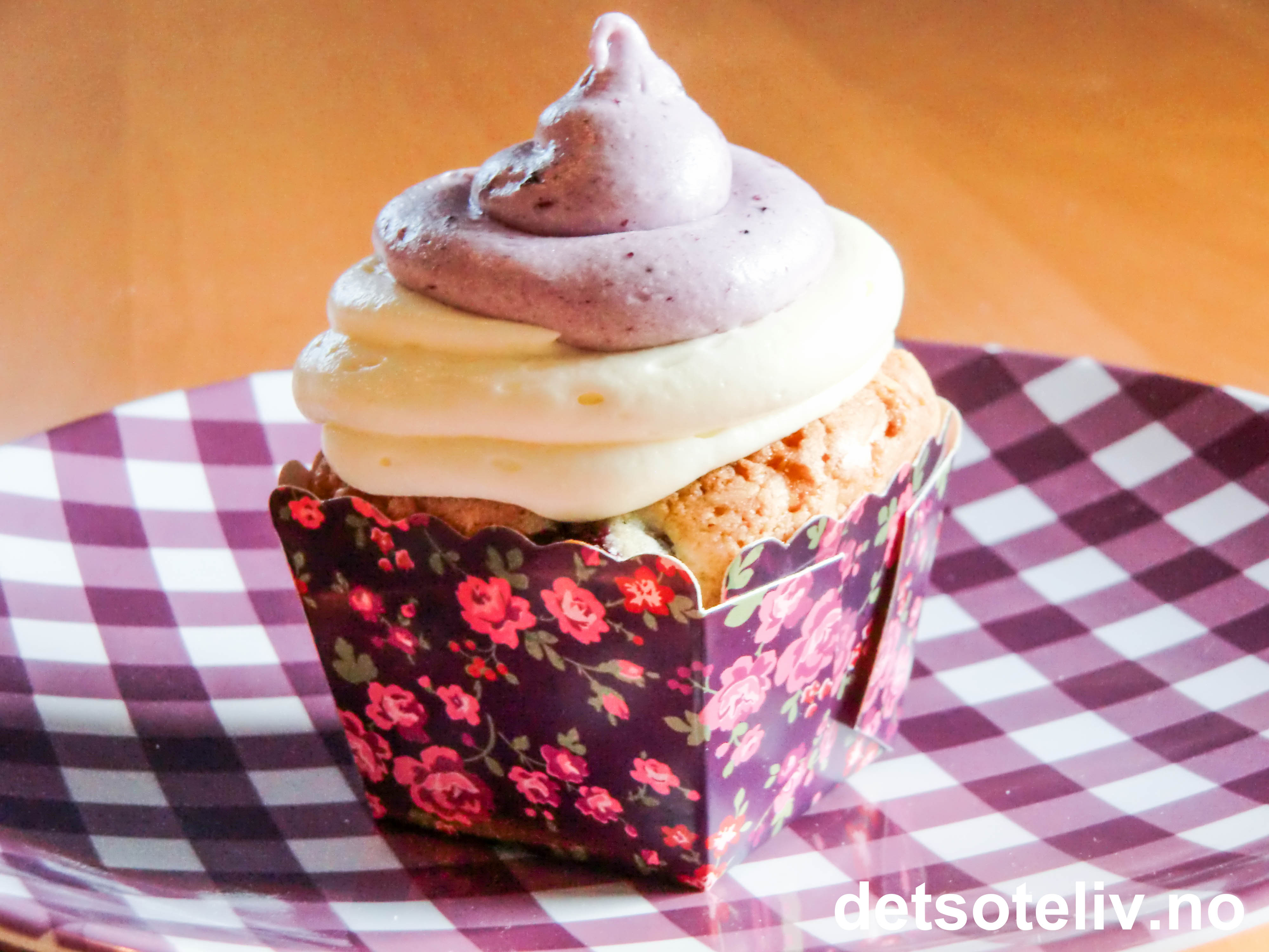 Disse cupcakesene er en kombinasjon av "Blueberry Cupcakes" og "Blueberry Cupcakes with White Frosting". Det går fint å lage alle tre varianter av samme oppskrift.