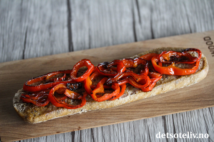 Dekk den nederste delen av baguetten med mesteparten av den stekte paprikaen.