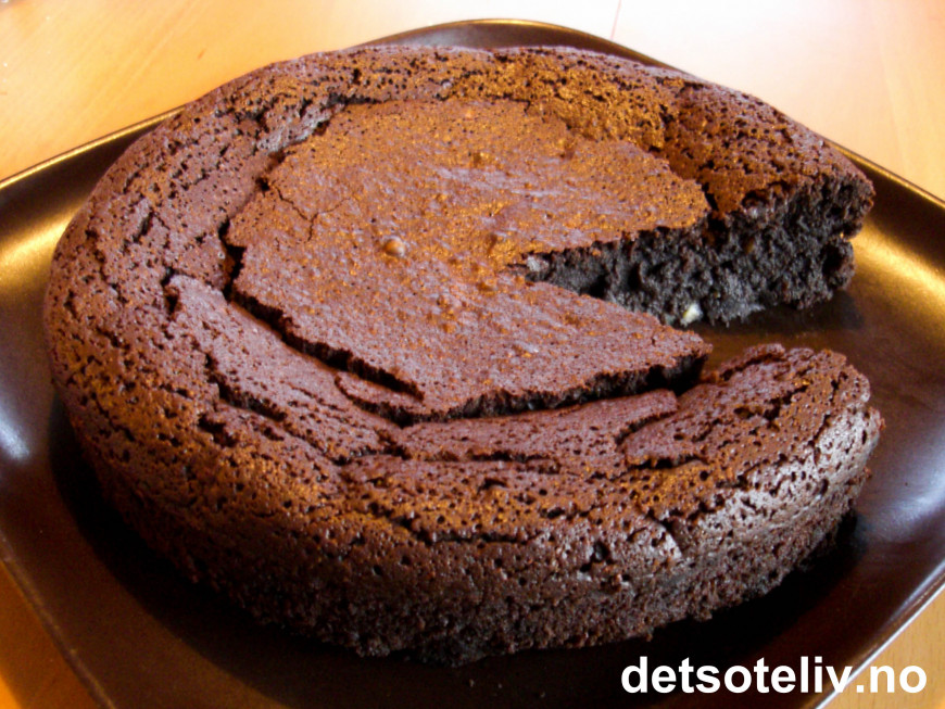Kaken er svart som natten og lages med sterk kaffe og skikkelig mørk sjokolade av god kvalitet. Kaken inneholder ikke noe mel, og får derfor en helt vidunderlig mektig og nesten litt kremete konsistens.