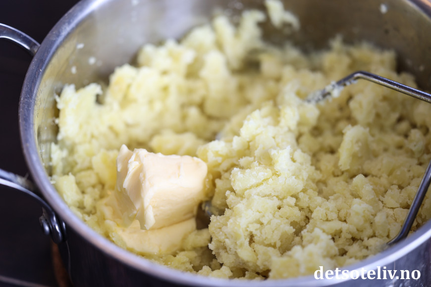 Kok potetbitene til de er helt møre. Sil vekk vannet. Mos de varme potetbitene med en potetstamper, som jeg bruker her, eller bruk en potetpresse. NB! Ikke bruk stavmikser (det kan gi seig potetstappe).