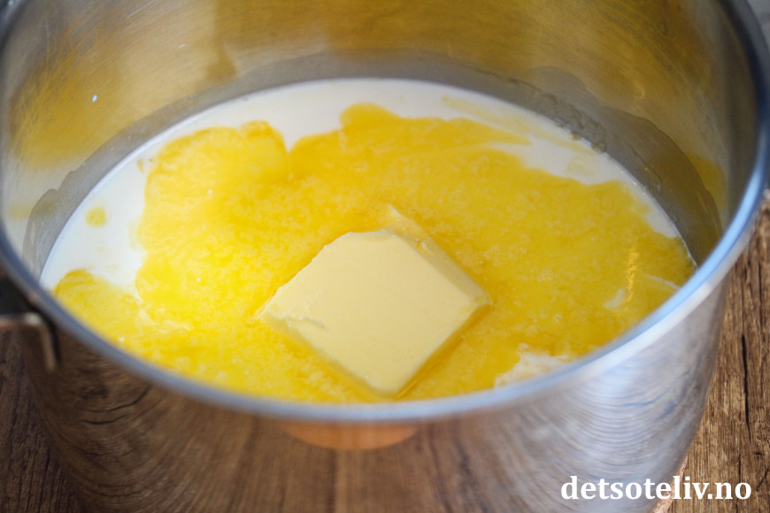 Kok opp melk, sukker og smør. Avkjøl blandingen til den er fingervarm (i underkant av 37°C). Rør gjæren ut i væsken.