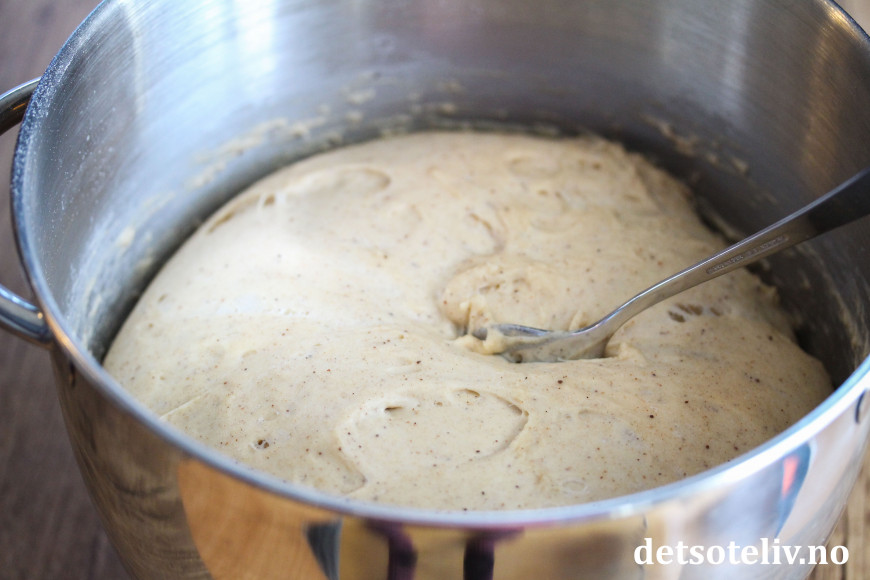 Bland i lett sammenvispet egg, kanel og hvetemel. Elt deigen godt i kjøkkenmaskinen til den er smidig.