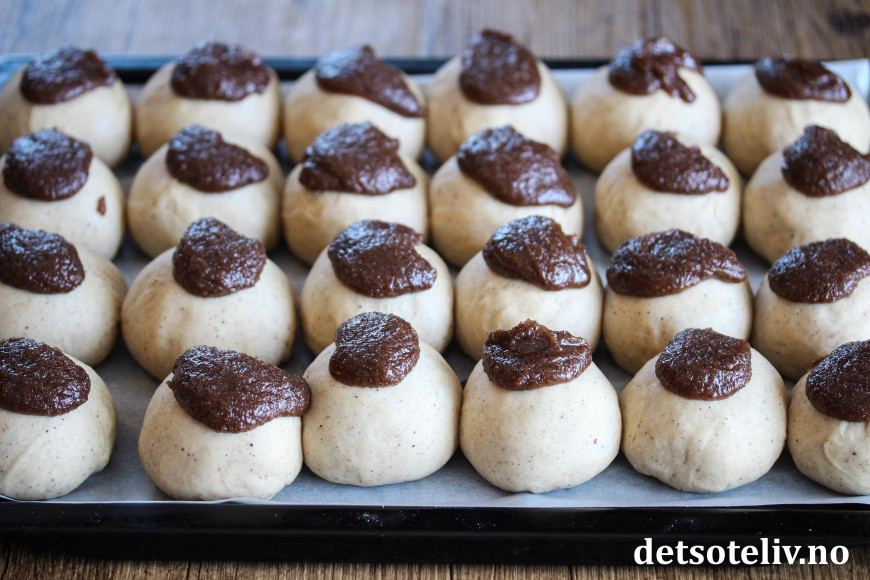 Trill ut deigen til 24 jevnstore boller, og sett dem på en bakepapirdekket stekeplate (4 x 6 rader).