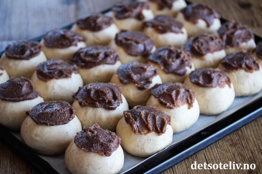 Legg en god klatt av den tykke kanelkremen på hver bolle.