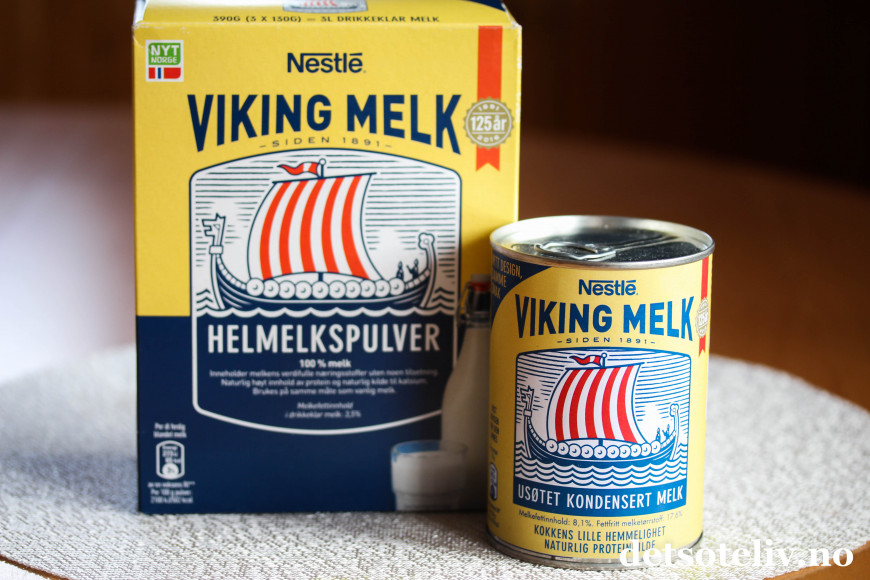 Jeg har tidligere omtalt den kondenserte melken fra Viking Melk blant annet i oppskriften Påskekake med vikingmelkfromasj. Kondensert melk selges på hermetikkboks og er melk der noe av vannet er dampet bort, slik at konsistensen blir mer fyldig enn vanlig melk. Dermed blir dette et supert alternativ til fløte i mange matretter og bakst. Du finner produktet i de fleste matbutikkene.
