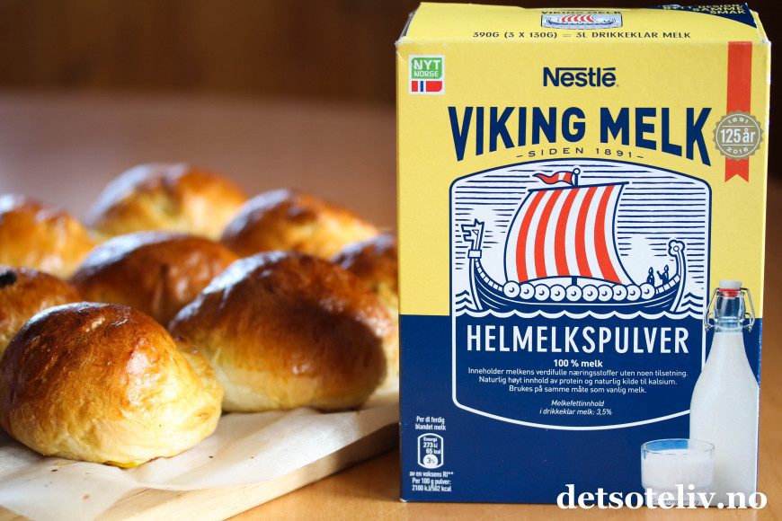 Tørrmelk er supert å bake med, og ikke minst gjelder det gjærbakst. En genial ting med tørrmelk er at man kan røre ut helmelkspulveret med litt mindre vann enn angitt ovenfor for å få fyldigere melk, som blir ekstra god å bake med. Jeg bruker i denne oppskriften 7 dl vann sammen med 1 pose helmelkspulver. Da oppnår man en ekstra flott og fyldig smak og konsistens på bollene.