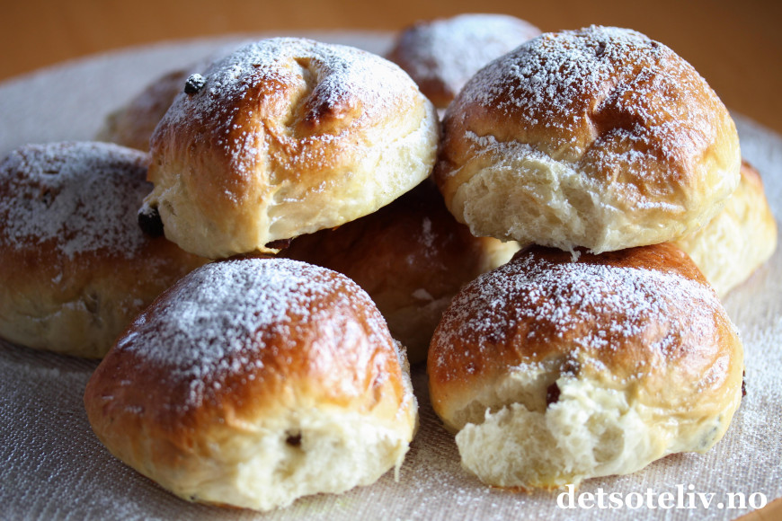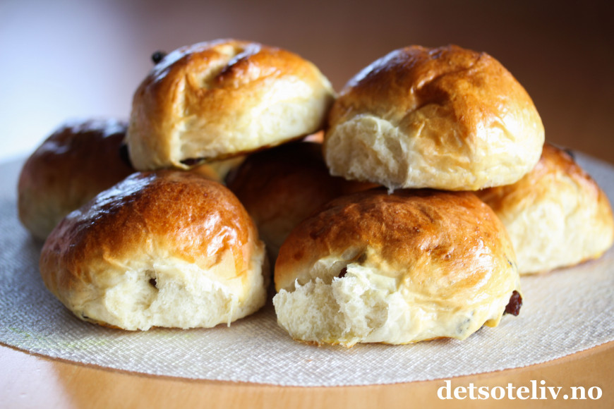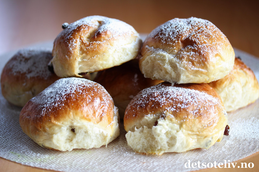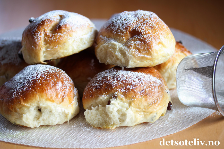 Denne gjærdeigen med tørrmelk kan brukes til alle typer gjærbakst. Jeg har her laget nydelige rosinboller med melisdryss. I morgen skal jeg vise deg hvordan jeg bruker samme deigen til å lage kjempedeilige boller med vaniljekrem og bær.