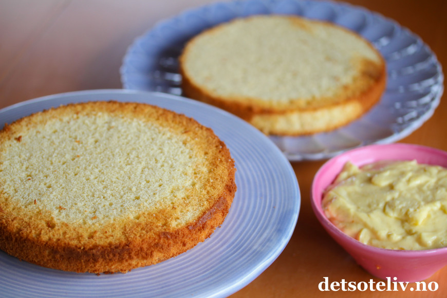 Ta kaken ut av formen og del den i to bunner. Skjær gjerne av toppen av kakene så de blir helt flate og lyse på toppen.