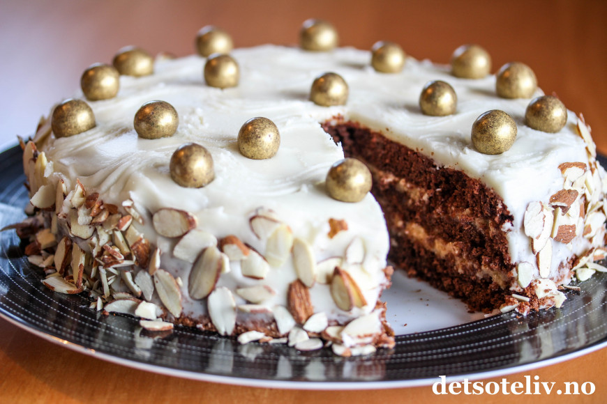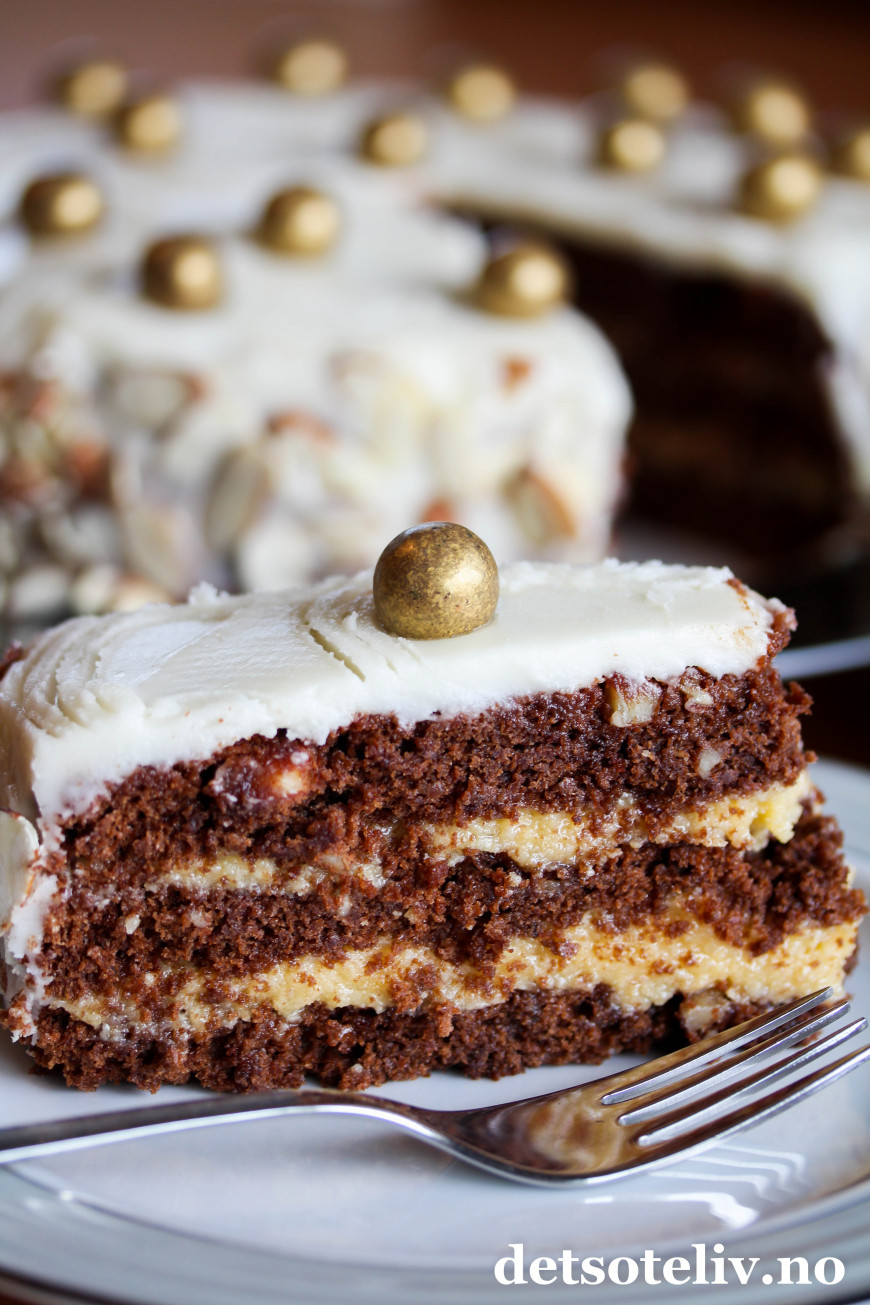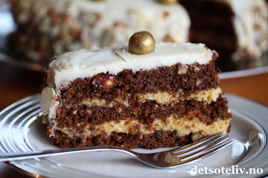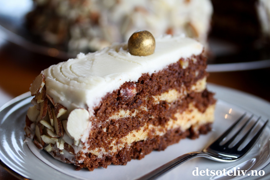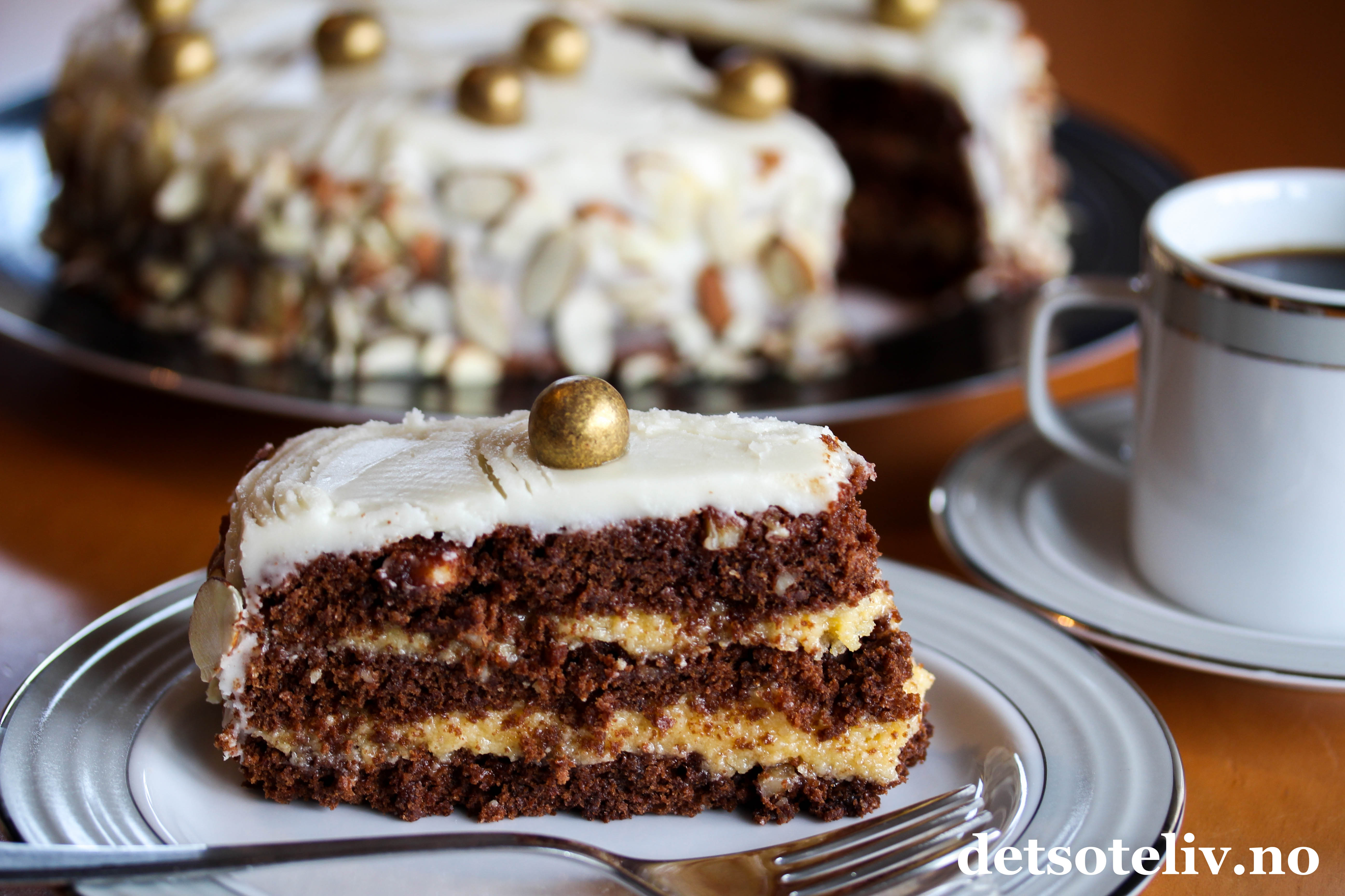 Det fine med denne kaken er at den ikke inneholder pisket krem og derfor er temmelig holdbar. Kaken tåler både å fryses og å oppbevares en god stund i romtemperatur, som er praktisk når man skal forberede fester.