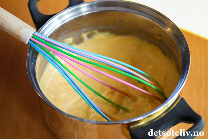 Ha eggeplommer og vikingmelk i en kjele. Varm opp blandingen under omrøring og la den deretter småkoke forsiktig i et par minutter på middels varme mens du visper hele tiden. Pass på så blandingen ikke svir seg i bunnen. Blandingen skal tykne og bli som en lys eggekrem.