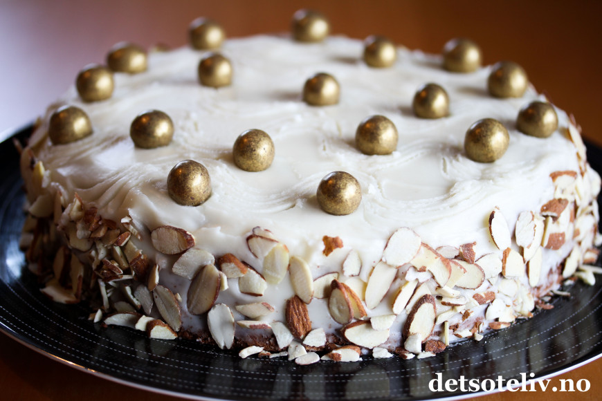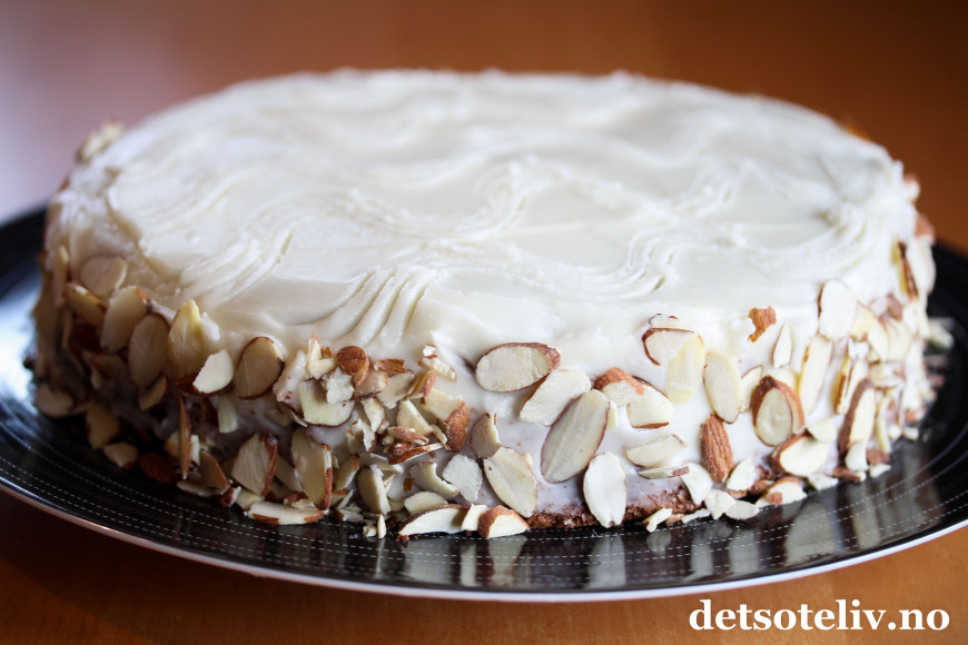 ♥ Kaken er nokså mektig, så ikke lag lokket med melisglasur på toppen av kaken altfor tykt. På den annen side synes jeg glasuren bør være tykk nok til at den dekker over kaken. Prøve deg frem! Glasuren trenger ikke å dekke sidene kaken, men bare gjøre kanten klissete nok til at mandelflakene fester seg rundt kanten av kaken.