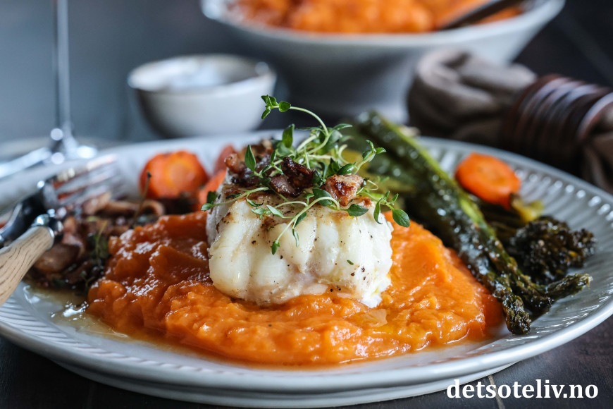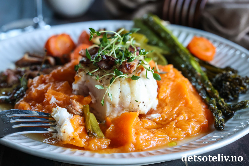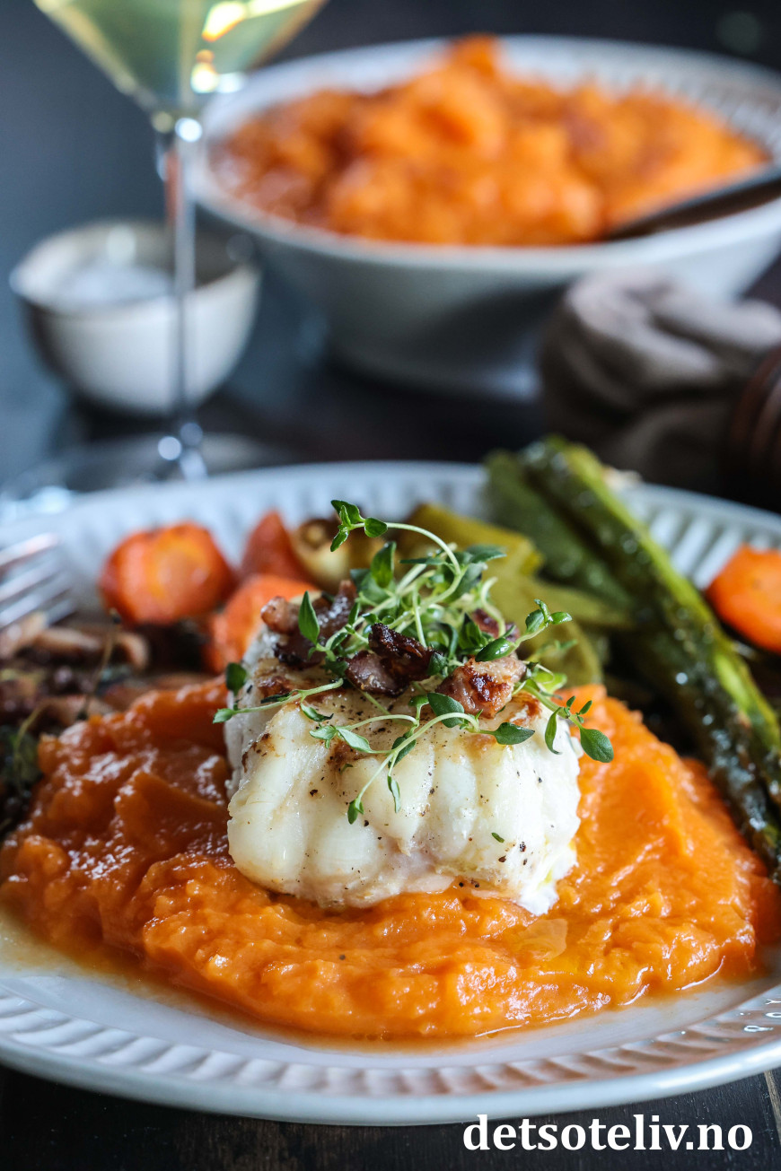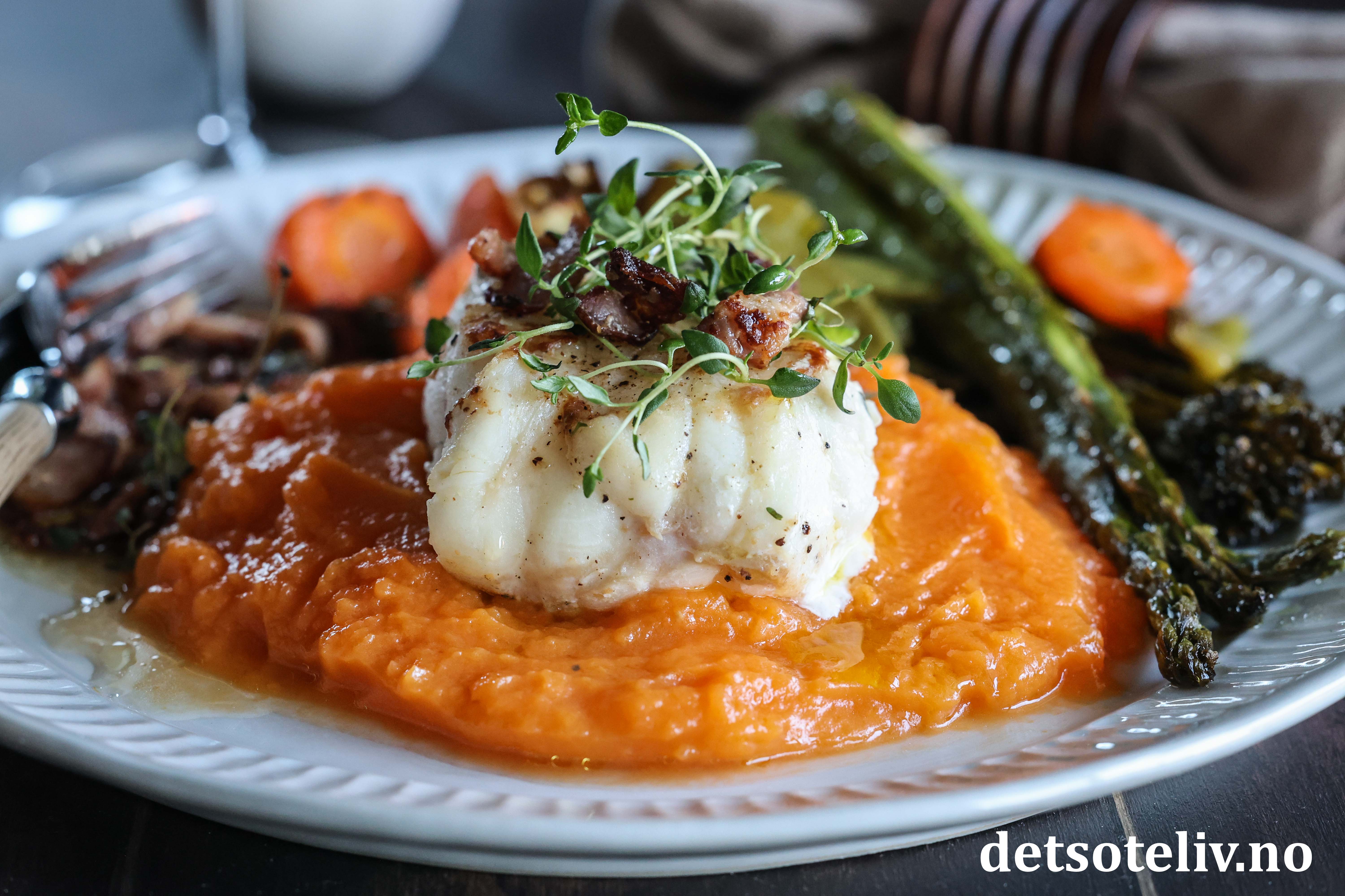 Her serveres fisken sammen med sprøstekt bacon, honningbakte grønnsaker og fløyelsmyk søtpotetpuré.