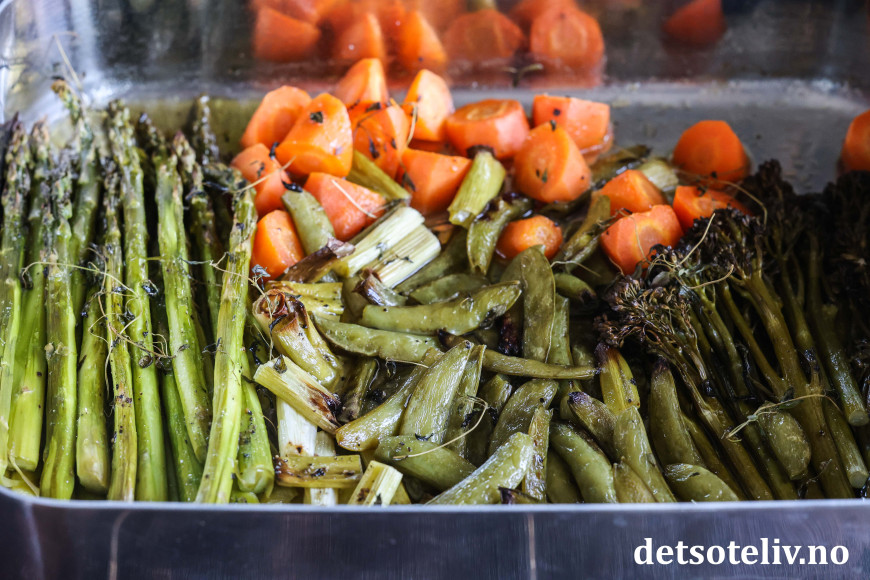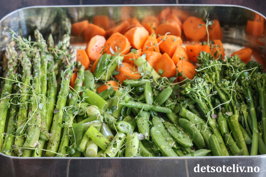 Steketiden er veiledende, så følg med. Hvis du ser at grønnsakene er ferdige, kan du dekke over formen med aluminiumsfolie og slå av varmen på ovnen. Da kan grønnsakene stå slik i ettervarmen og holder seg varme til du er klar til å servere dem.