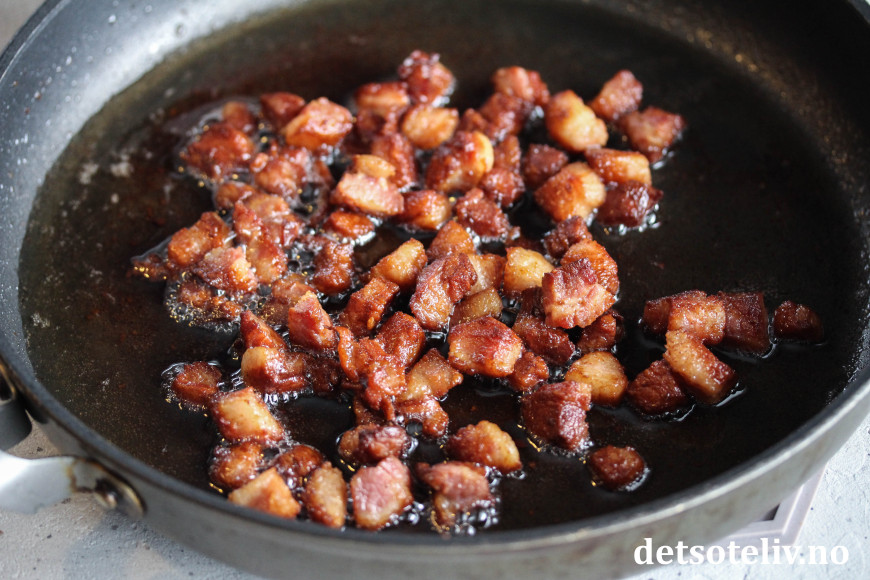 Stek baconet på middels varme til bitene blir gylne og sprø. Dette tar en stund (8 - 10 minutter) dersom du bruker baconterninger i stedet for tynne baconskiver som du skjærer i biter. Du vil etter hvert se at terningene avgir mye av fettet som da blir liggende i pannen.